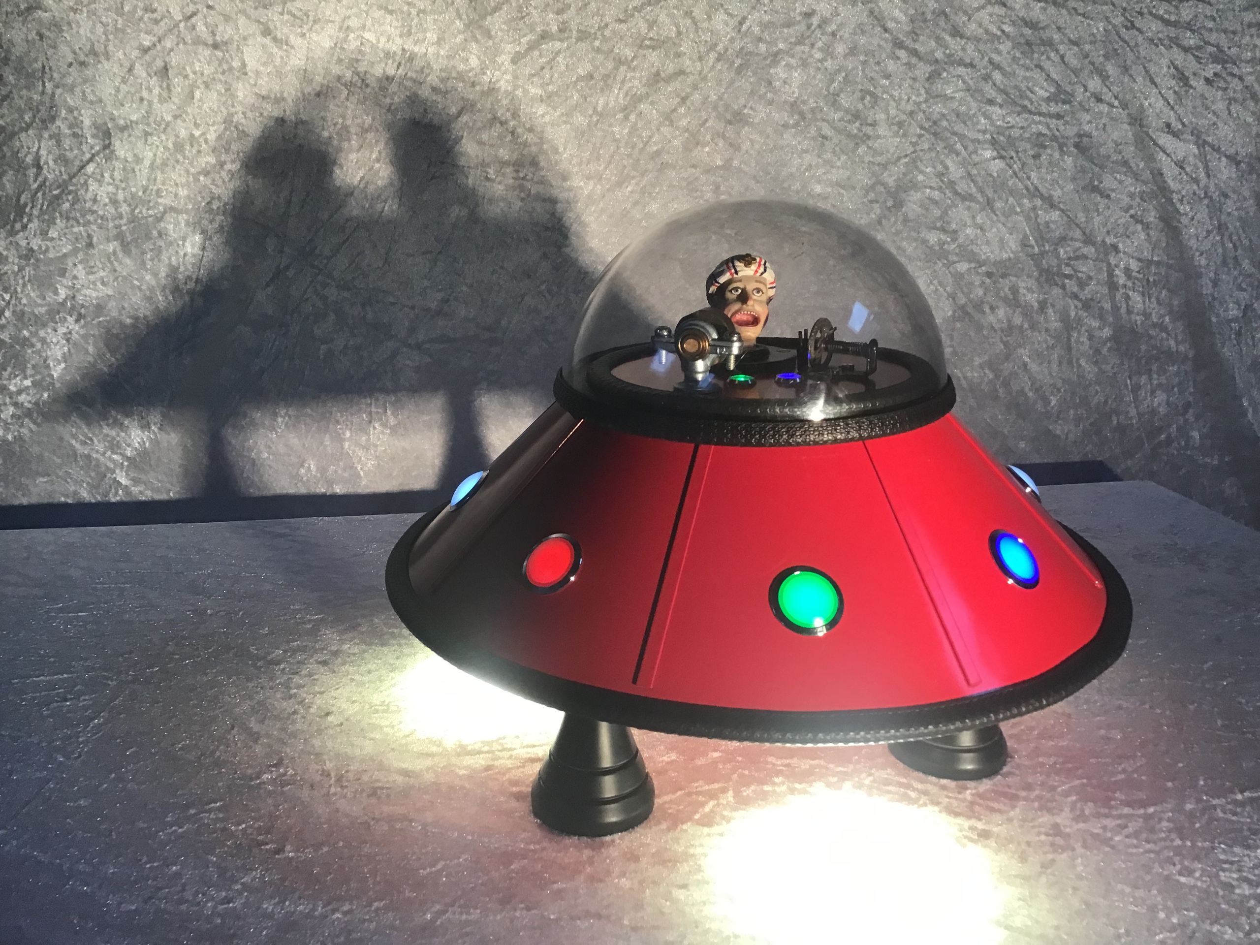 Gemaakt van niet meer gebruikte voorwerpen. Een rvs lampenkap, gordijnroe hangers, pizza pan, manometer, balans van een uurwerk, halve plastic bol. Voorzien van 3 ledlmpjes aan de onderzijde en 2 in de cockpit. De lamp is voorzien van een dimmer