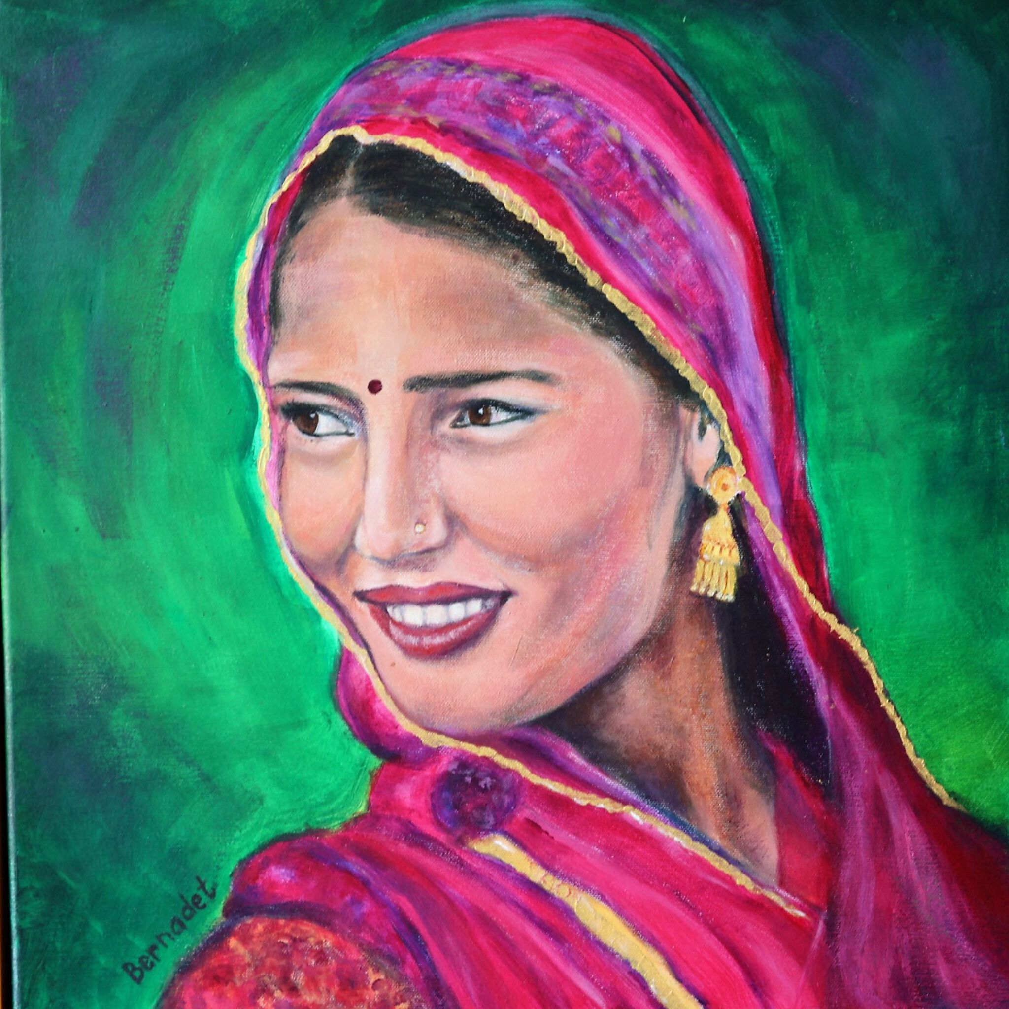 Acryl Rose Groen Vrouw Portret Kleurrijk Gezicht Ogen Vierkant Realistisch Doek Kunst Mooi Vrouwelijk Neus India Sluier 50 Exotisch Lach Stip Vrouwengezicht Mondiaal Uitheems Rania