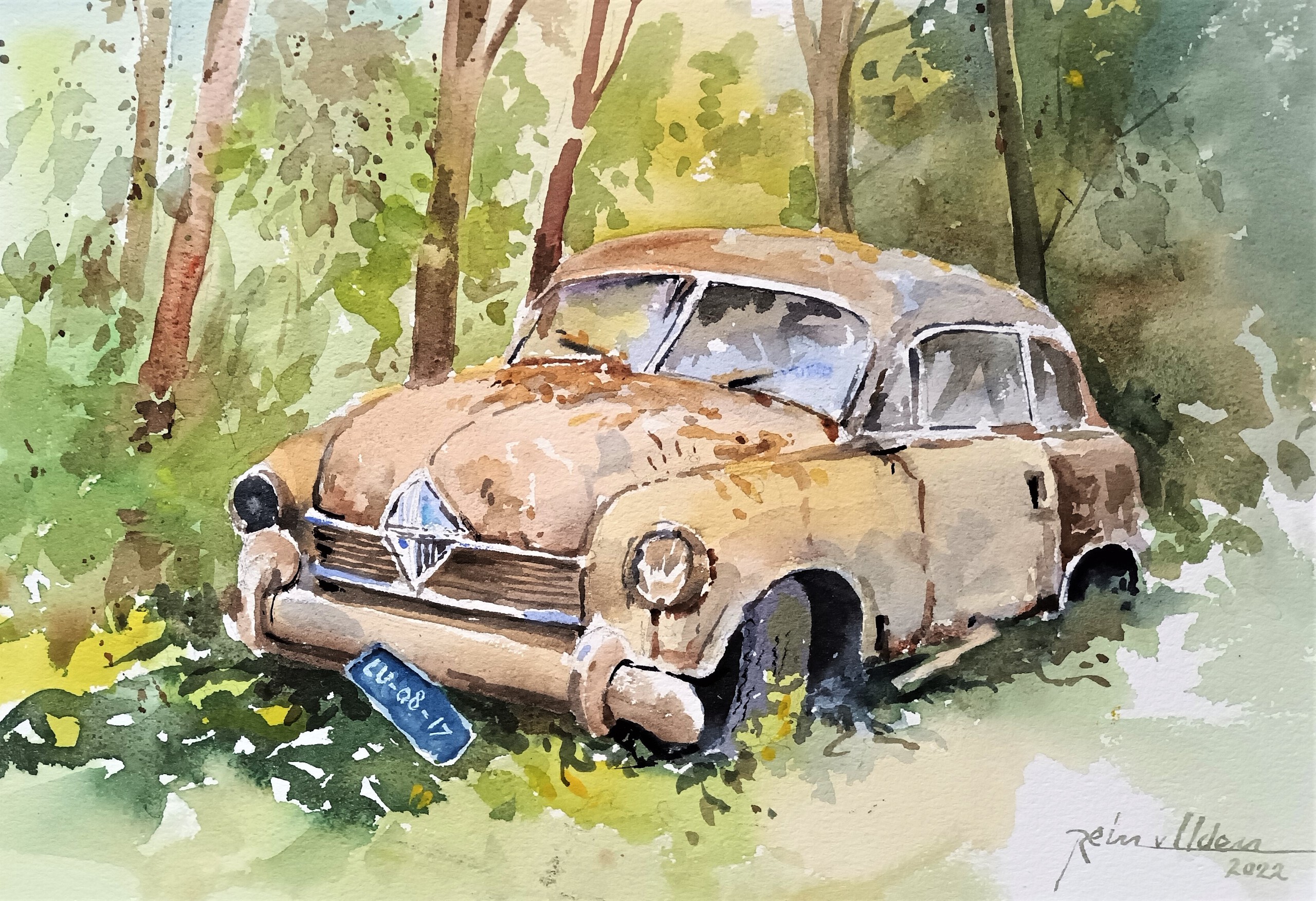 Oude Auto Schroot Bossen Roest Aquarel