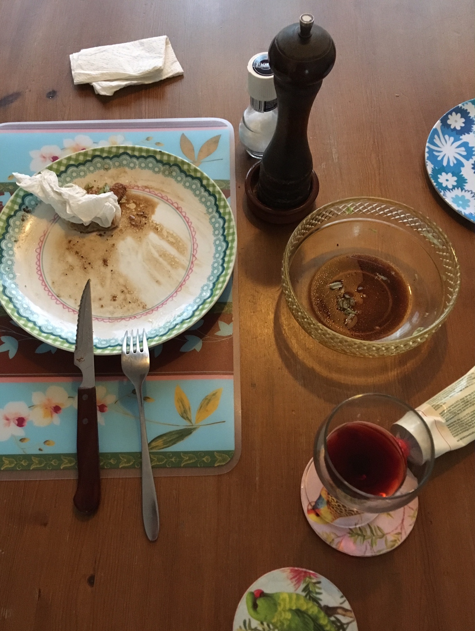 Ossenhaas, champignons, gebakken aardappelen, salade en een glas Merlot