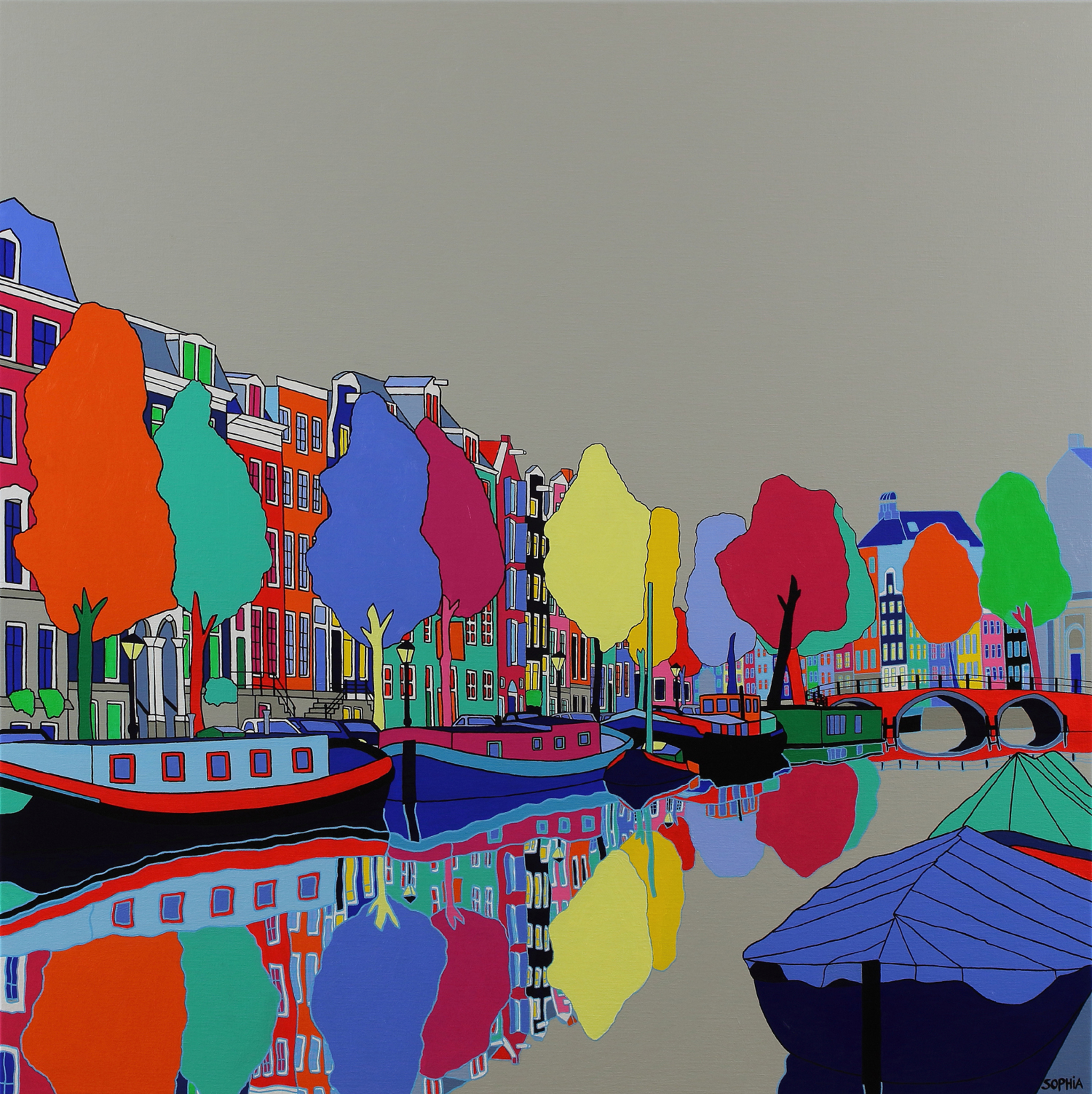Wit Figuratief Grijs Modern Oranje Geel Zwart Blauw Rose Groen Water Kleurrijk Amsterdam Bomen Lucht Holland Weerspiegeling Europa Reflectie Stadsgezicht Hedendaags Nederland Grachten Magenta Gevels