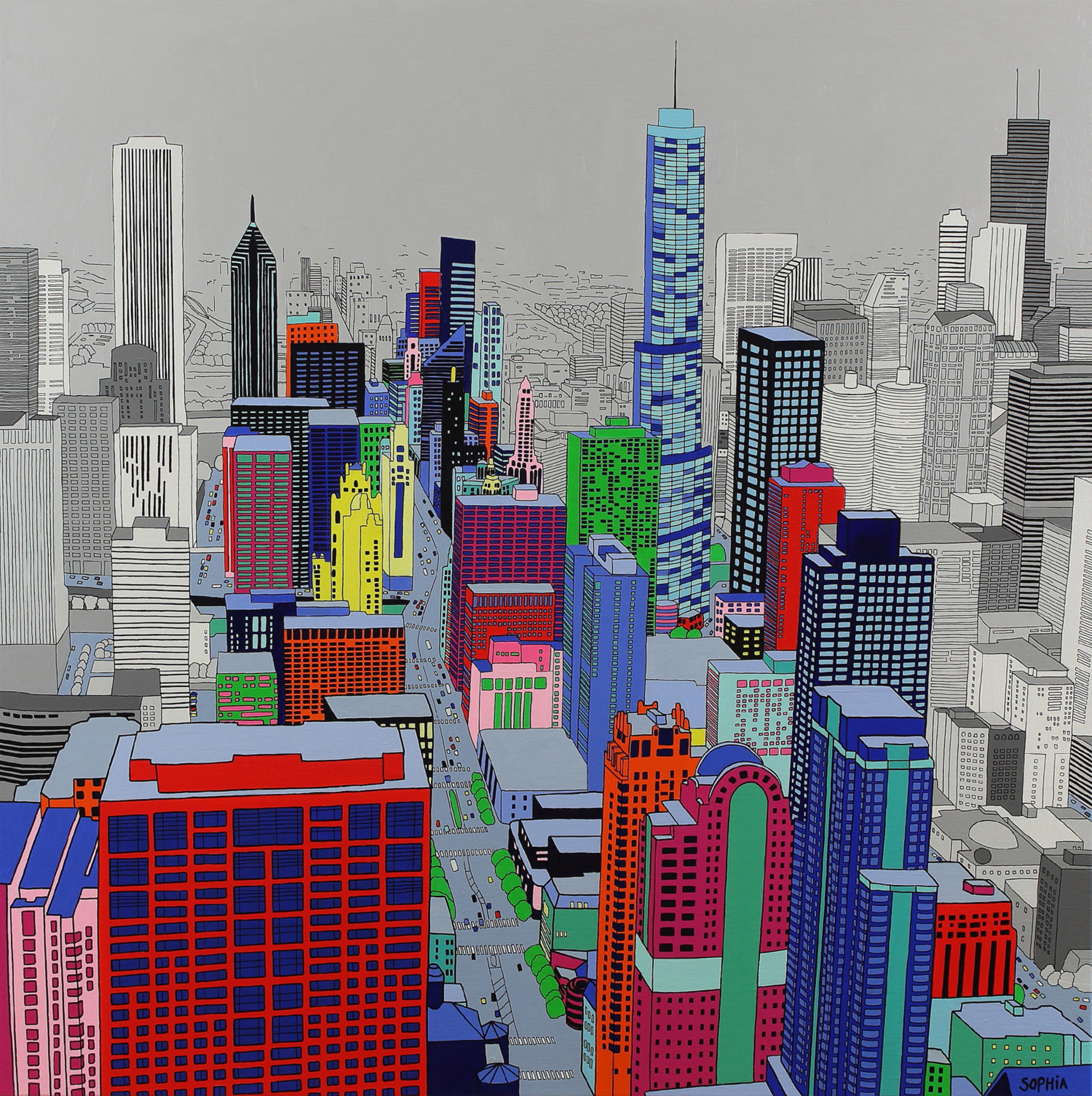 Wit Abstract Figuratief Modern Rood Oranje Geel Zwart Blauw Groen Roze Lijnen Uitzicht Stadsgezicht Hedendaags Gebouwen Amerika Torens Chicago Usa Tower Verenigde Staten Wereldstad Sears