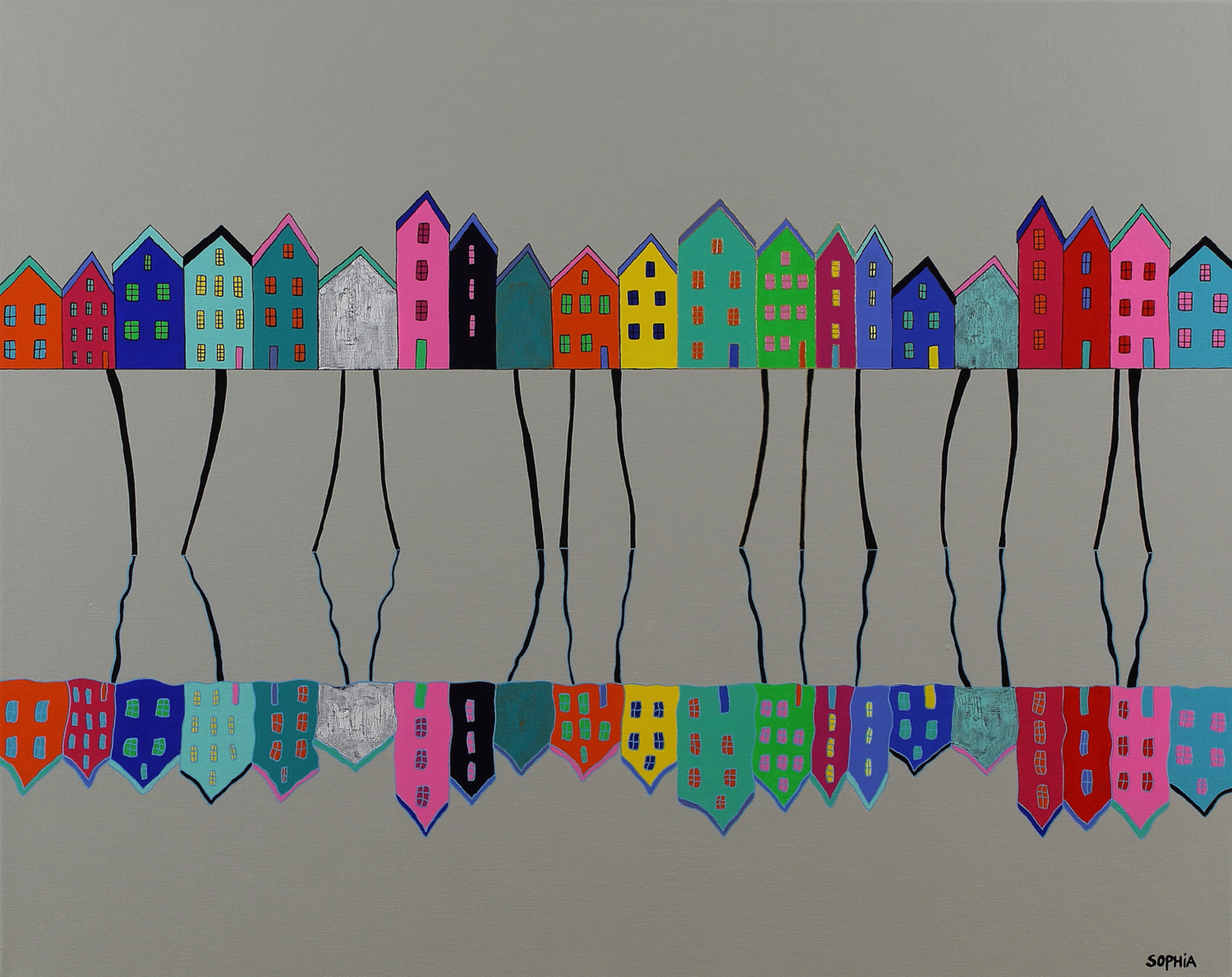 Wit Figuratief Grijs Modern Rood Oranje Geel Zwart Blauw Rose Groen Water Weerspiegeling Reflectie Speels Huisjes Magenta Naief