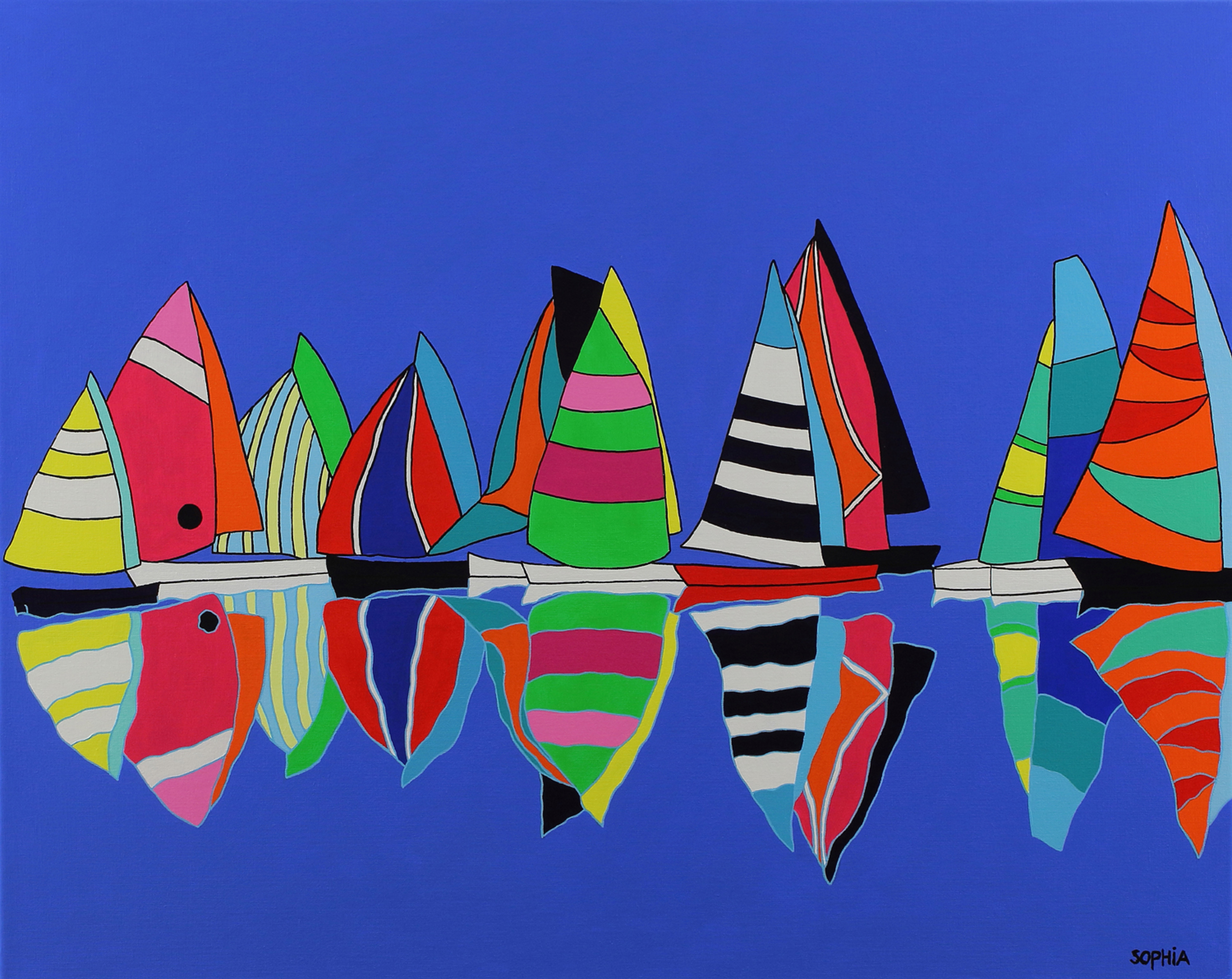 Wit Zee Figuratief Modern Rood Oranje Geel Zwart Blauw Groen Water Kleurrijk Roze Vrolijk Weerspiegeling Reflectie Speels Zeilen Hedendaags Meer Varen Magenta Zeilboot Naief