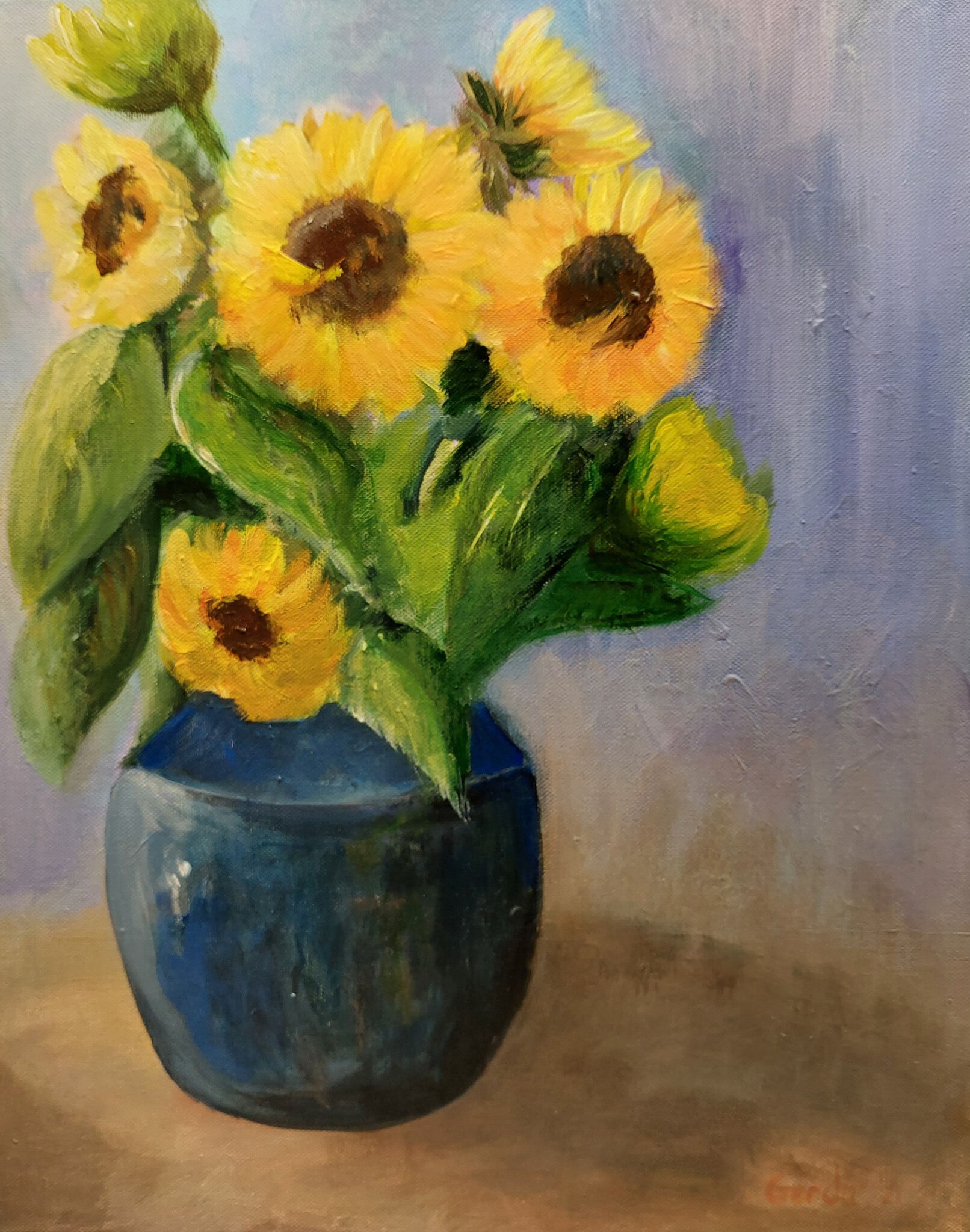 Stilleven Blauw Vaas Zomer Zonnebloemen