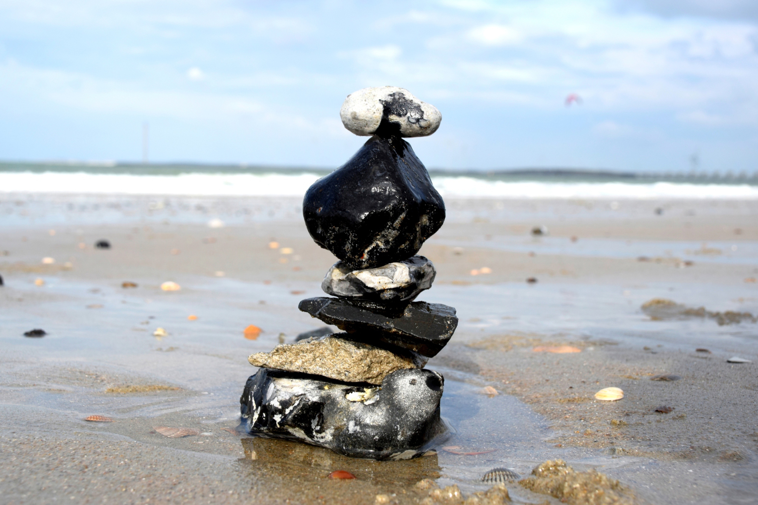 Stenen Stapel Yoga Zee Strand Foto Zon Wind Aarde Water Lucht Vuur Steen