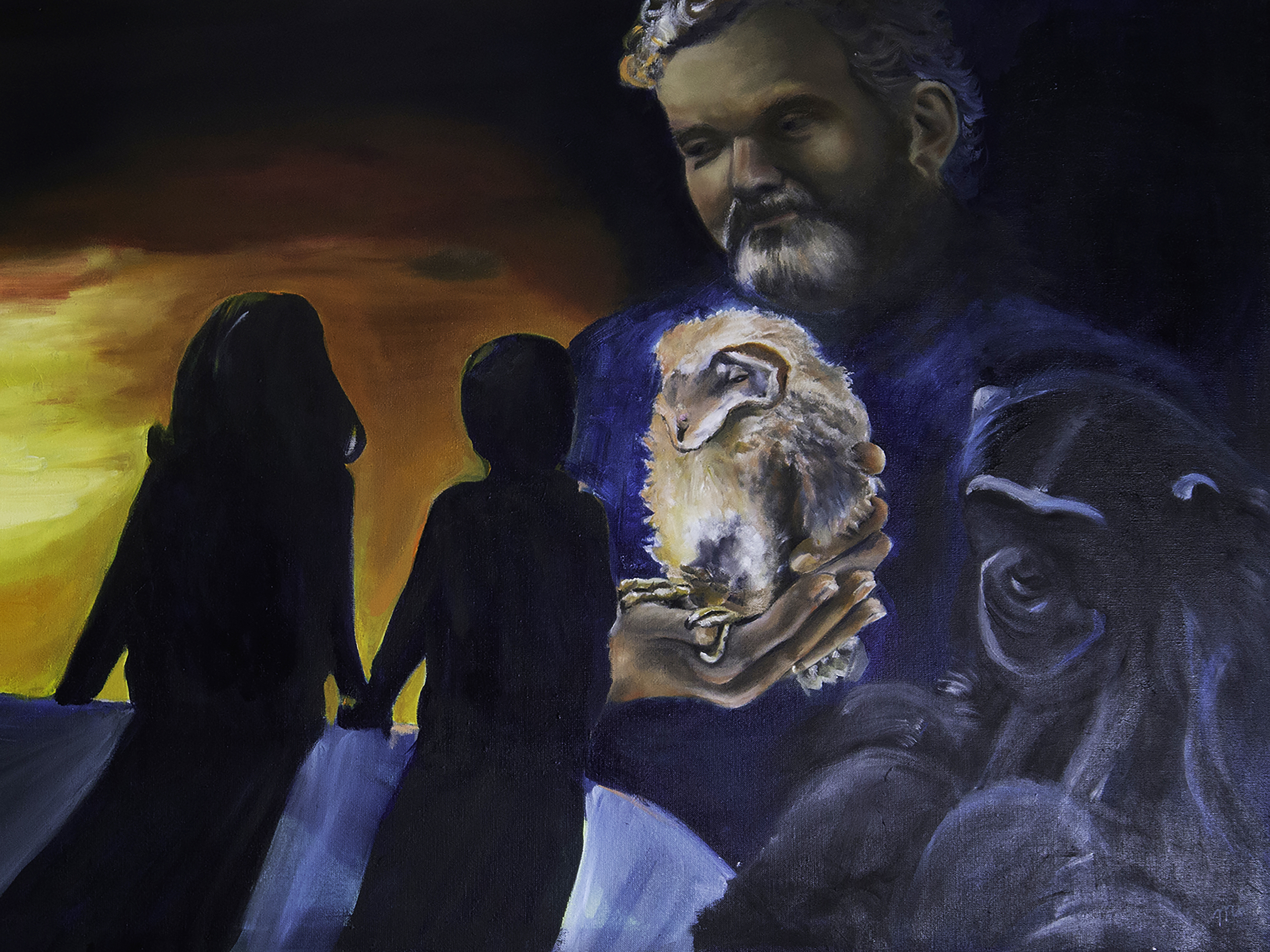 I started painting in portrait mode with this painting. I wanted to capture my neighbor with his cargo bike. Yet I also wanted to connect a story to it. In the Corona crisis, I wanted to put the climate crisis in the spotlight. I also wanted to do something with the next generation, but with a view to the future. The monkey represents a primate without intelligence as in humans.... Could there have been a climate crisis too? On the other hand, people have with their intelligence to tackle the climate crisis