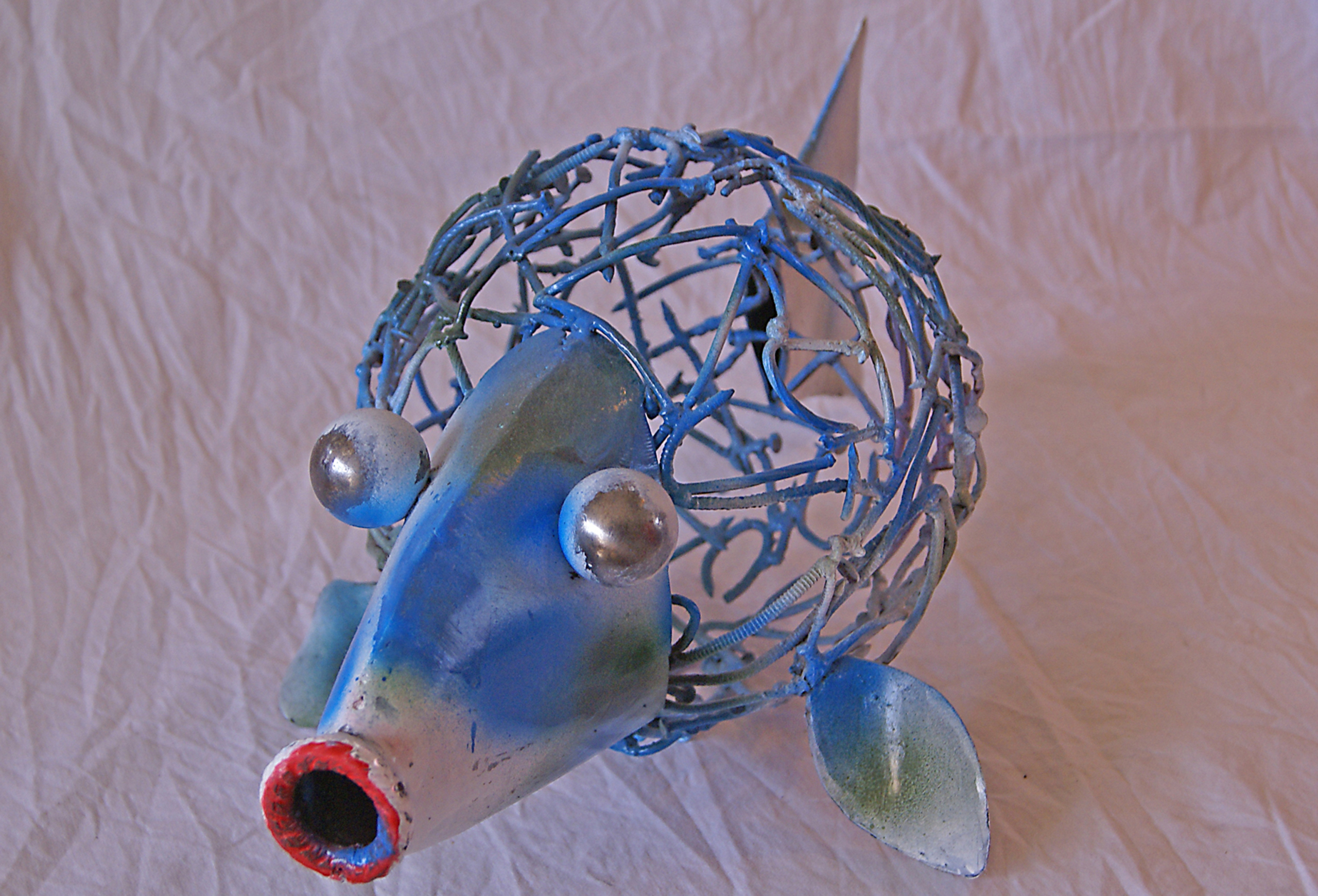 Kogelvis vervaardigd van gebruikte spijkers; kop en vinnen in cortenstaal uitgevoerd en in een blauwe tint afgewerkt.