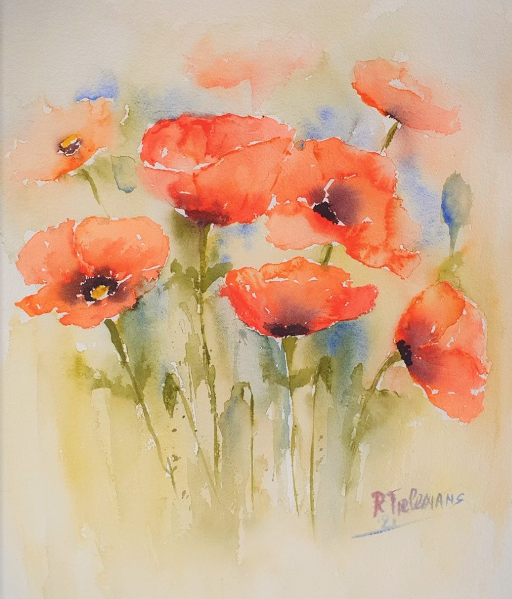 Kunstprinten van dit werk zijn ook verkrijgbaar. Deze aquarel straalt een delicate en poëtische schoonheid uit, waarin de kunstenaar de essentie van klaprozen op meesterlijke wijze heeft gevangen. De levendige rode tinten van de bloemen contrasteren prachtig met de zachte, diffuse achtergrond, die een dromerige sfeer oproept. Door het gebruik van vloeiende penseelstreken en subtiele kleurvervaging ontstaat een gevoel van beweging, alsof de bloemen zachtjes wiegen in de wind. De compositie is harmonieus en evenwichtig, waarbij de klaprozen centraal staan, omringd door een aura van licht en luchtigheid. De groene stelen en bladeren zijn met een losse techniek geschilderd, waardoor ze een organisch en spontaan karakter krijgen. De kunstenaar heeft met schijnbare eenvoud een emotionele connectie gecreëerd tussen natuur en toeschouwer. De signatuur rechtsonder voegt een persoonlijk element toe aan het werk, dat zowel technisch verfijnd als expressief is. Dit schilderij nodigt uit tot contemplatie en waardering voor de fragiele schoonheid van de natuur.