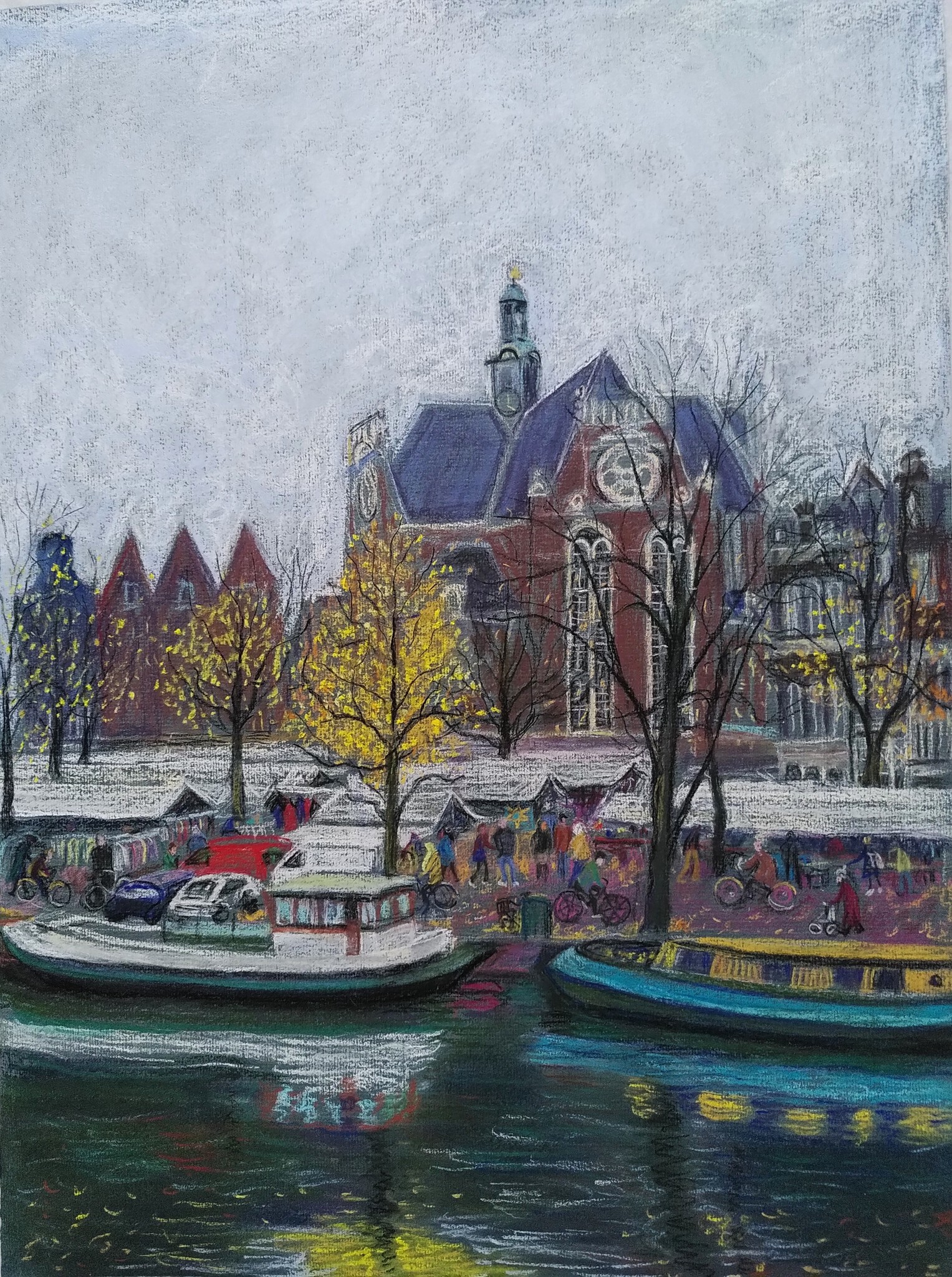 De maandag markt vanaf de Prinsengracht getekende.