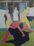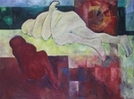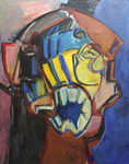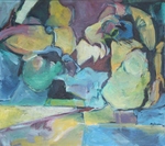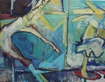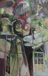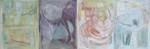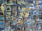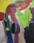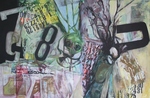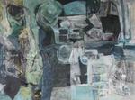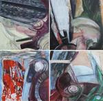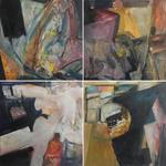 compositie met geometrische abstracte vormen. Door collage en montagetechnieken zijn de vormen opgebouwd uit vlakken met zeer verschillen texturen.