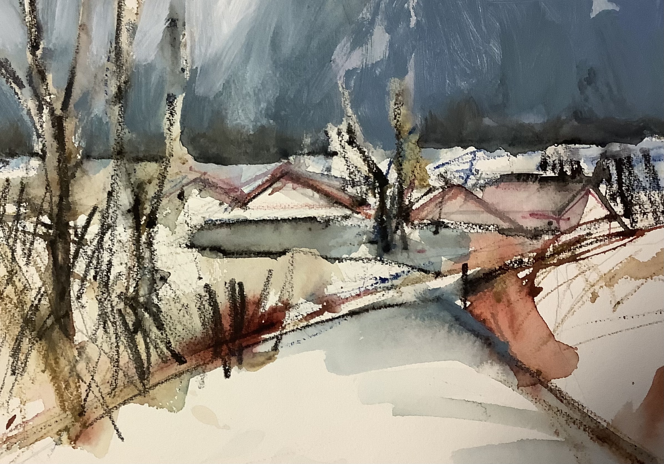 Een vlugge schets met inkt en aquarelpotlood van de omgeving van waar ik woon.