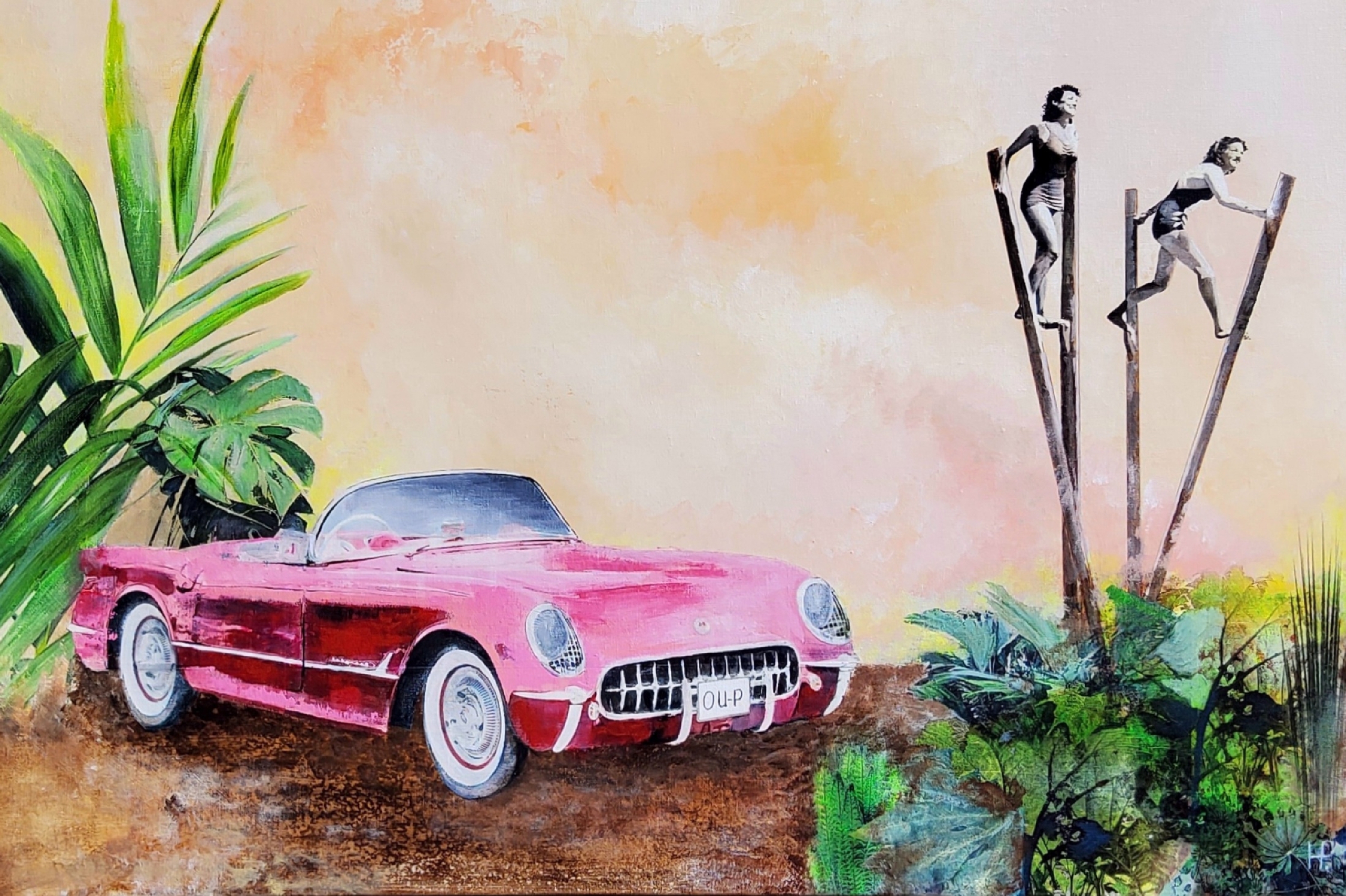 Geschilderd op een linnen opgespannen doek . Doek met hout en aluminium frame. Direct op te hangen . Een prachtige oude rose auto . De dames dwalen op hun stelten door de jungle VERKOCHT