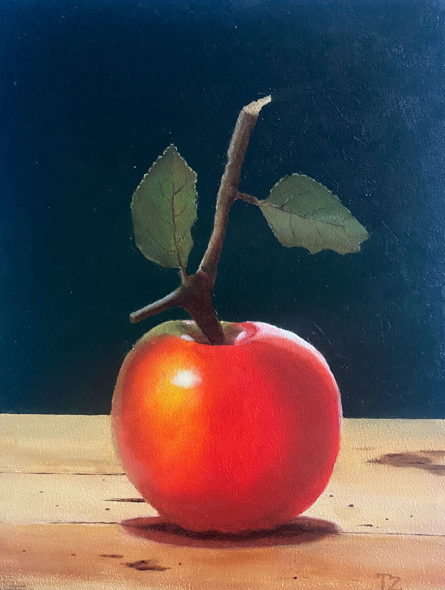 De appel ligt op tafel, rijp en sappig om meteen op te eten.