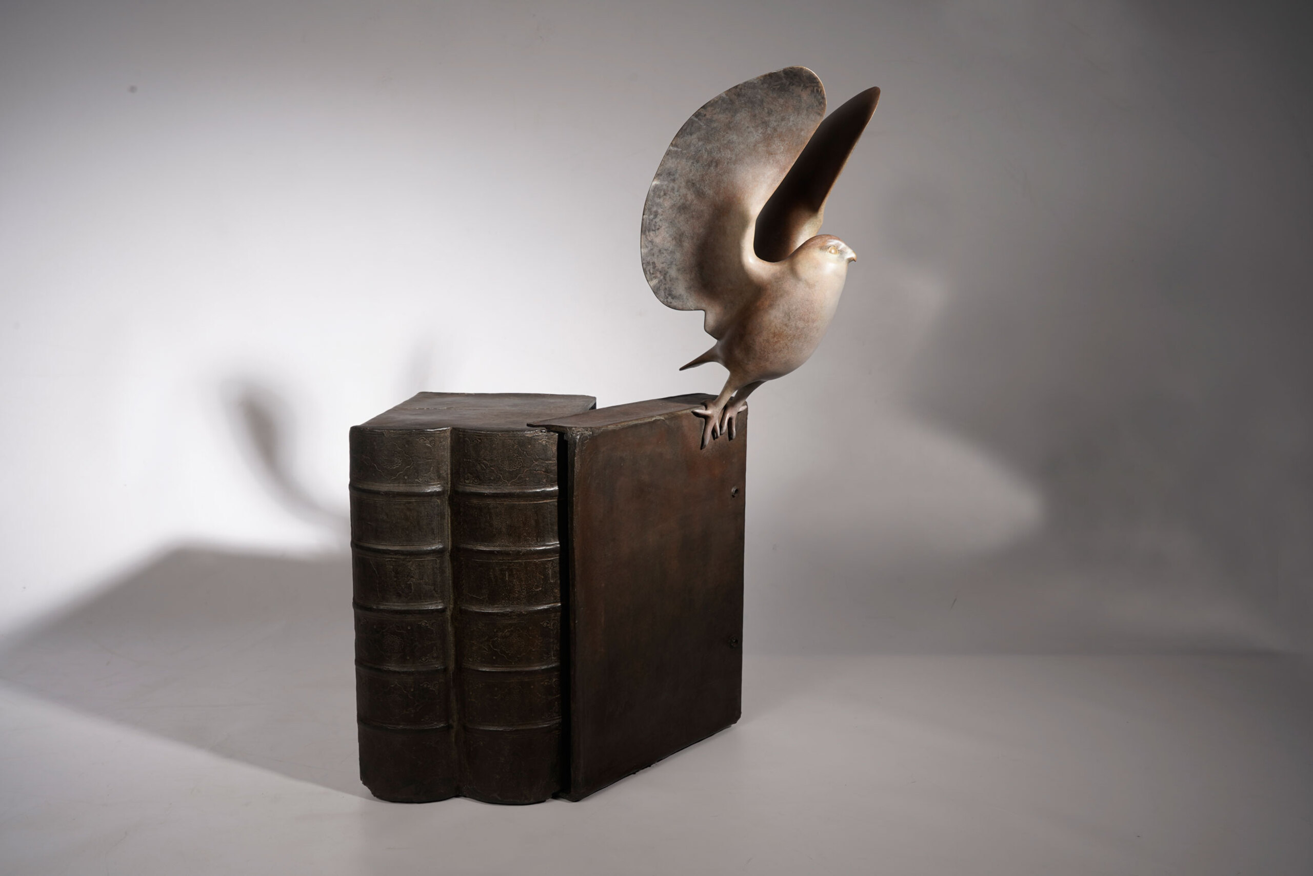 Bronzen boekenkaft met wegvliegende steenuil, de boekenkaft kan open op toe scharnieren naar gelang je eigen gevoel bij het beeld.