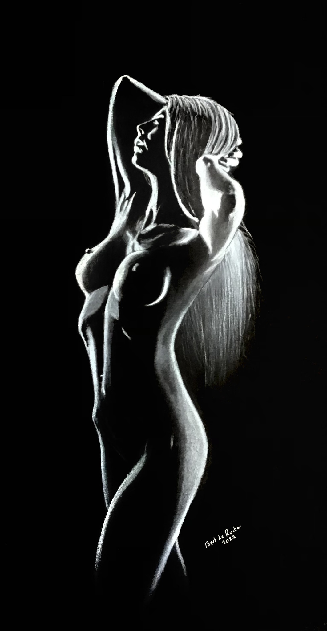 Vrouwelijk naakt minimalistisch geteken met wit krijt op zwart papier