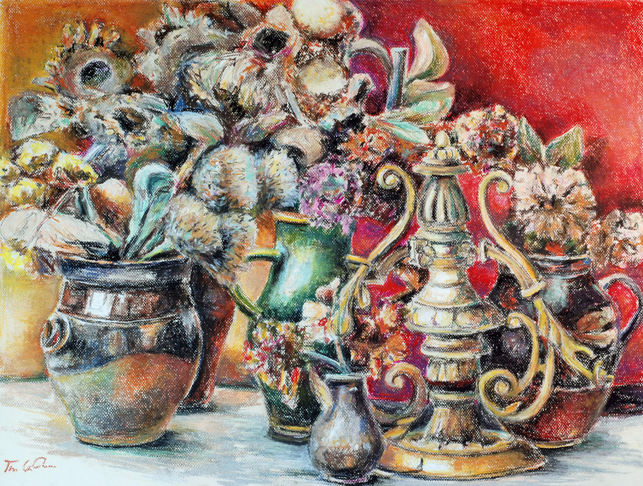 Gedroogde zinnia's en een ornament van een lamp waren het uitgangspunt voor deze ongedwongen compositie. Het werk is goudkleurig ingelijst met een passe partout.