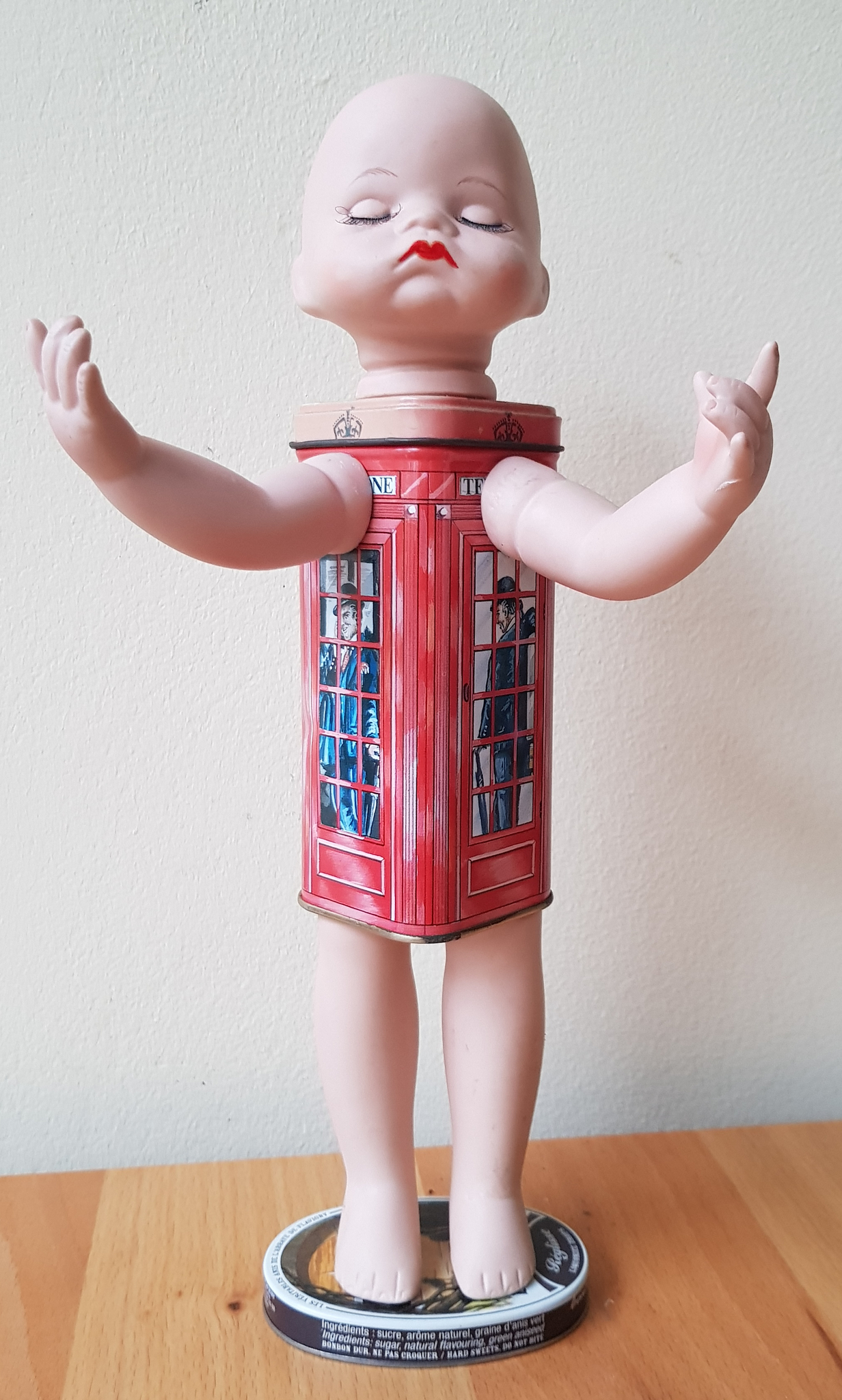 Een busje van een oude telefooncel en een pop die er met weemoed afscheid van neemt