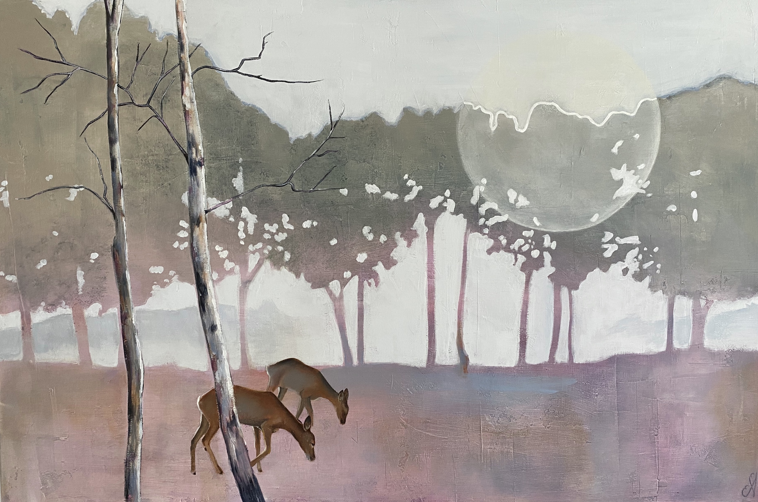 Modern Landschap Groen Maan Geabstraheerd Olieverf Oilpaint Natuur Bomen Green Landscape Moon Pastelkleur Lila Hert Berken Trees Deer Birch Naturen Pur-le Pastelcolor