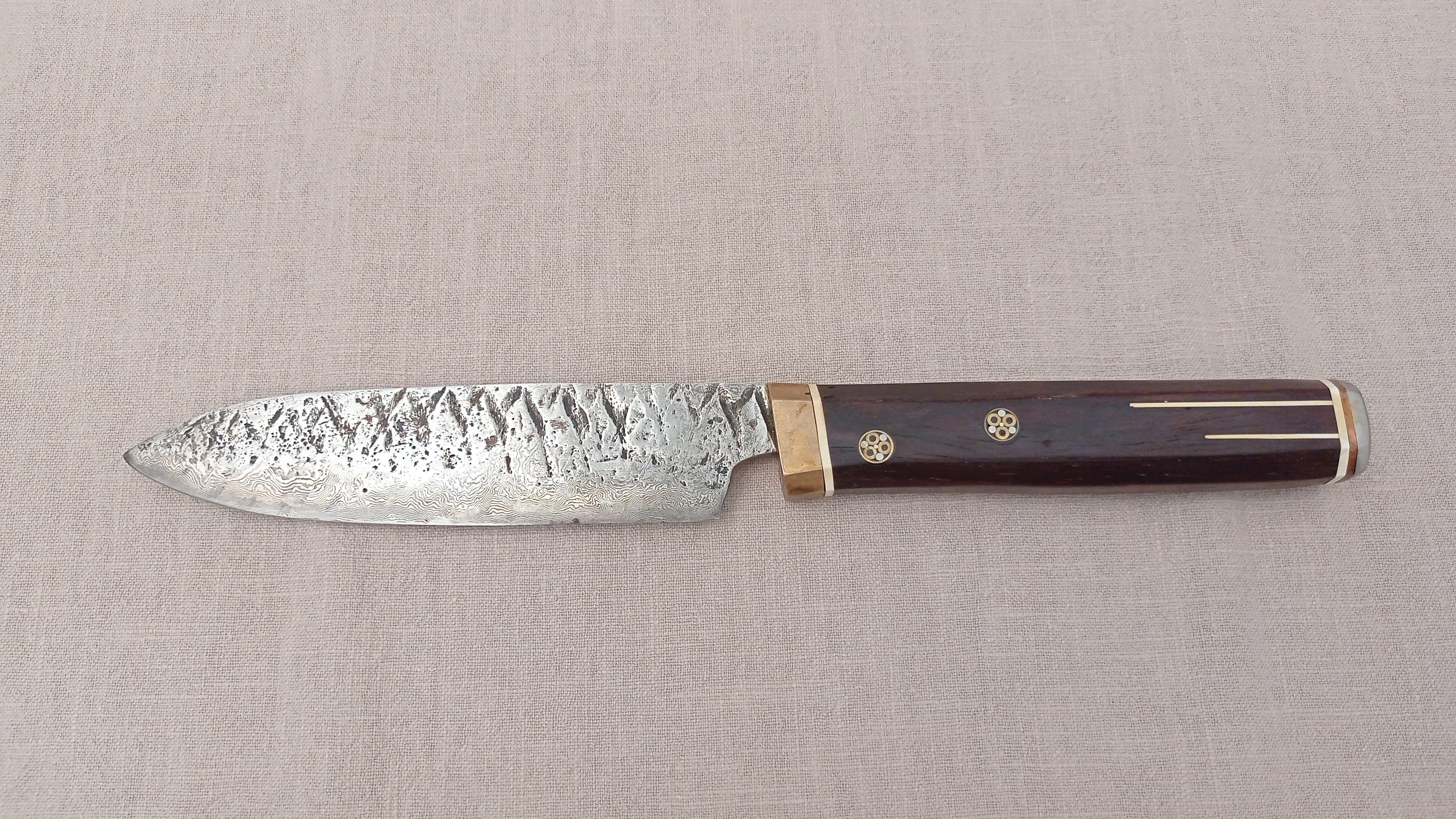 ( mes 1 van de mes kasteel ) het blad is gemaakt van raindrop damast De helft van het blad is opzettelijk grof gelaten ,waardoor er nog een mooie grove patroon zichtbaar is. het handvat is van Cocobolo hout , messing, pvc ,rood koper mozaiek pinnen en roestvrij staal .