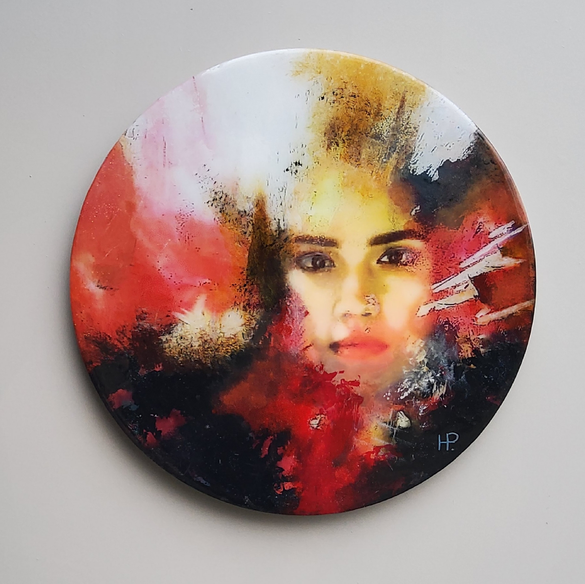 Geschilderd op aluminium dibond . Techniek acryl. pigmenten, epoxy resin, Rond schilderij 40 cm. doorsnee.