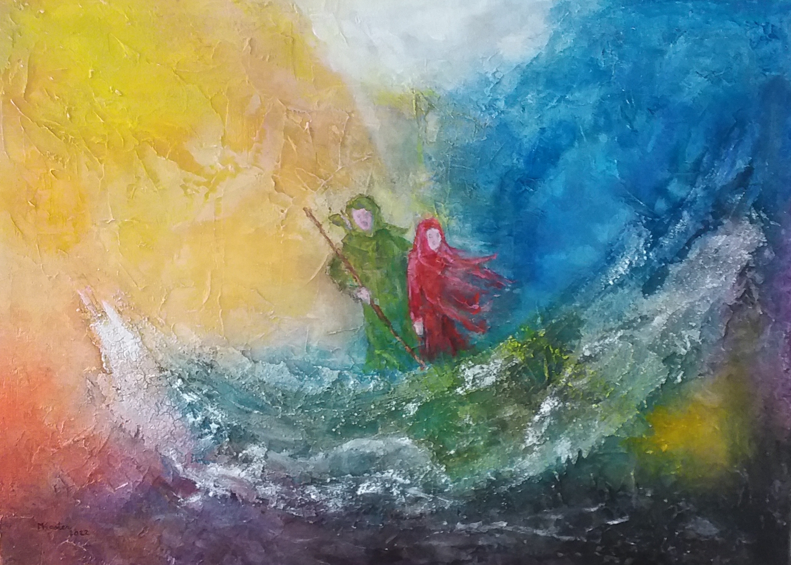 Storm in je leven. Storm op zee. Een bijbels gegeven. Acryl met structuren. Compleet met zwarthouten baklijst en gevernist.