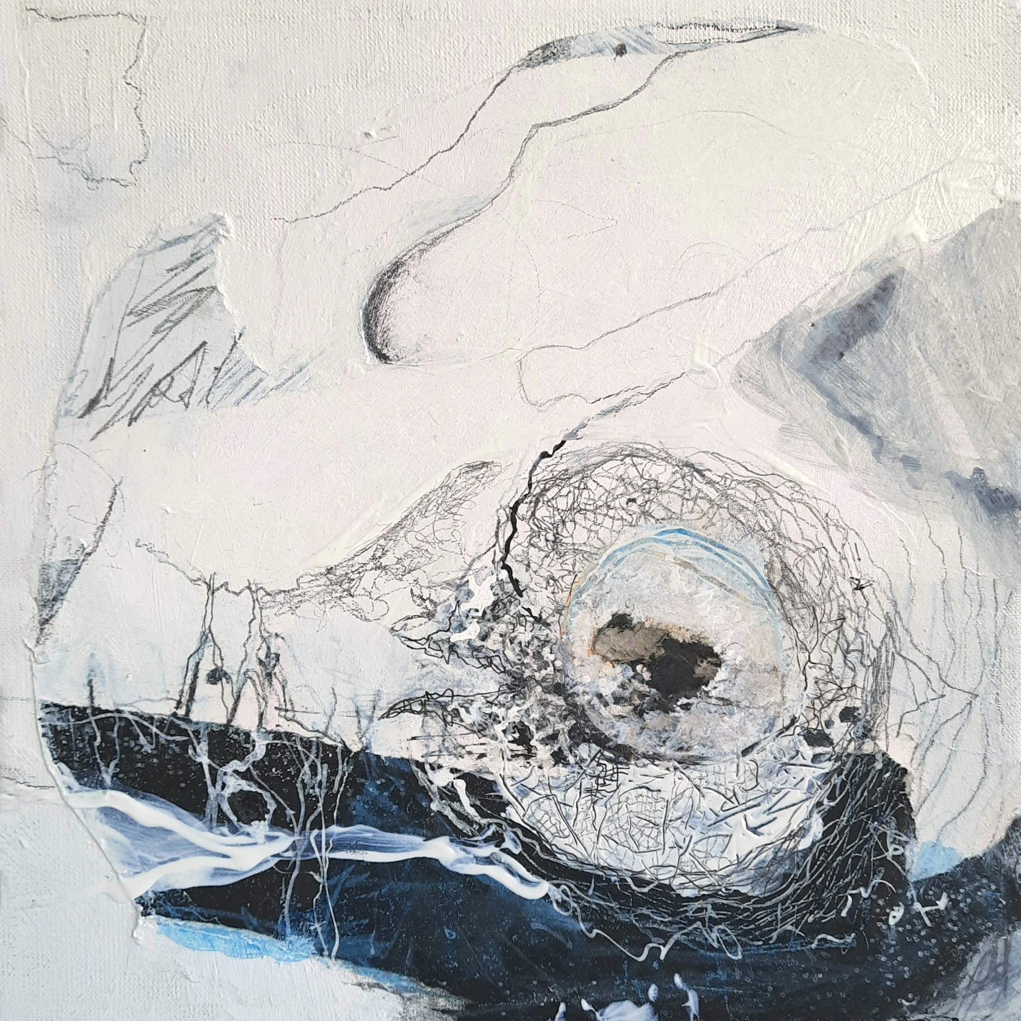 Schilderij Wit Zwart Landschap Vogel Klein Nest Vierkant Tekening Painting Landscape Drawing Bird Mixedmedia Small