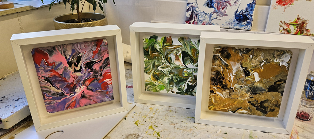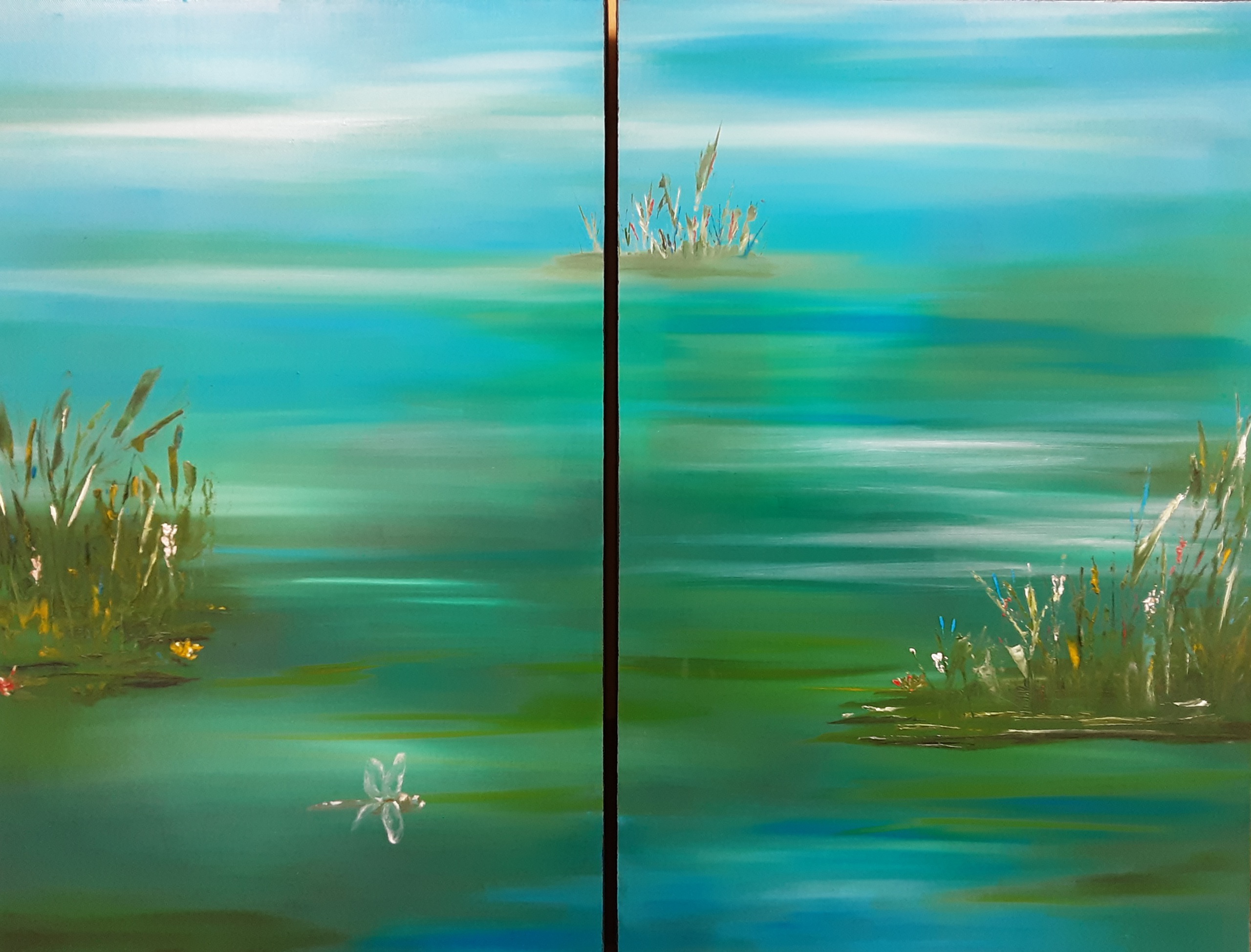 2 doeken van 40x60...wat zal ik erop maken.. dit is het geworden. Heerlijke kleuren die me erg aanspreken.. en de Libelle zwevend naar....