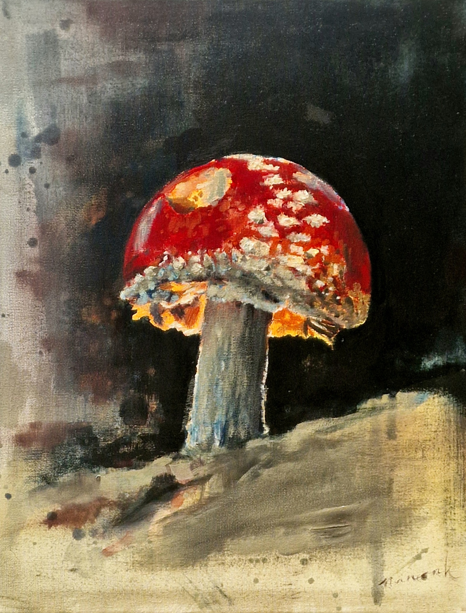Uit deze giftige vliegenzwam heeft toch iemand een hapje genomen, wat de aanwezigheid van deze mysterieuze schimmel nog intrigerender maakt. De krachtige belichting, die lijkt op een zacht lampje dat vanuit het bos straalt, geeft de zwam een bijna magische uitstraling. Het contrast tussen de felrode hoed en de schaduwrijke omgeving roept vragen op: wie durfde dit risicovolle avontuur aan te gaan? De natuur houdt immers haar geheimen goed verborgen.