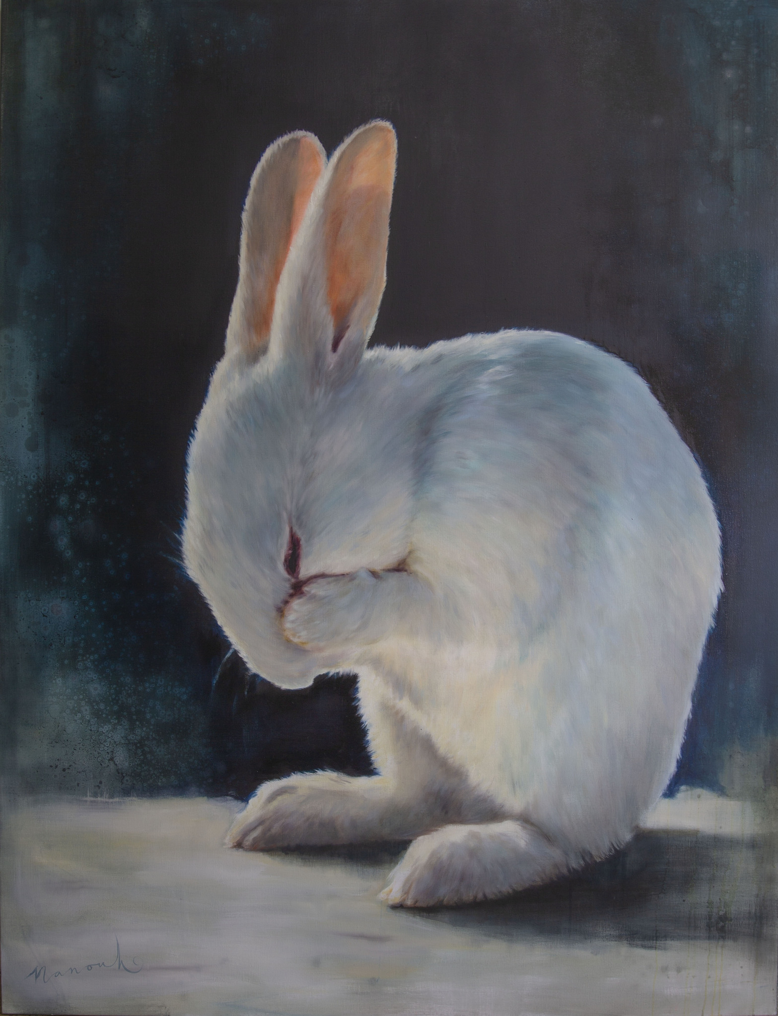 Zeer groot olieverfschilderij van een heel klein baby Belgisch haaskonijntje