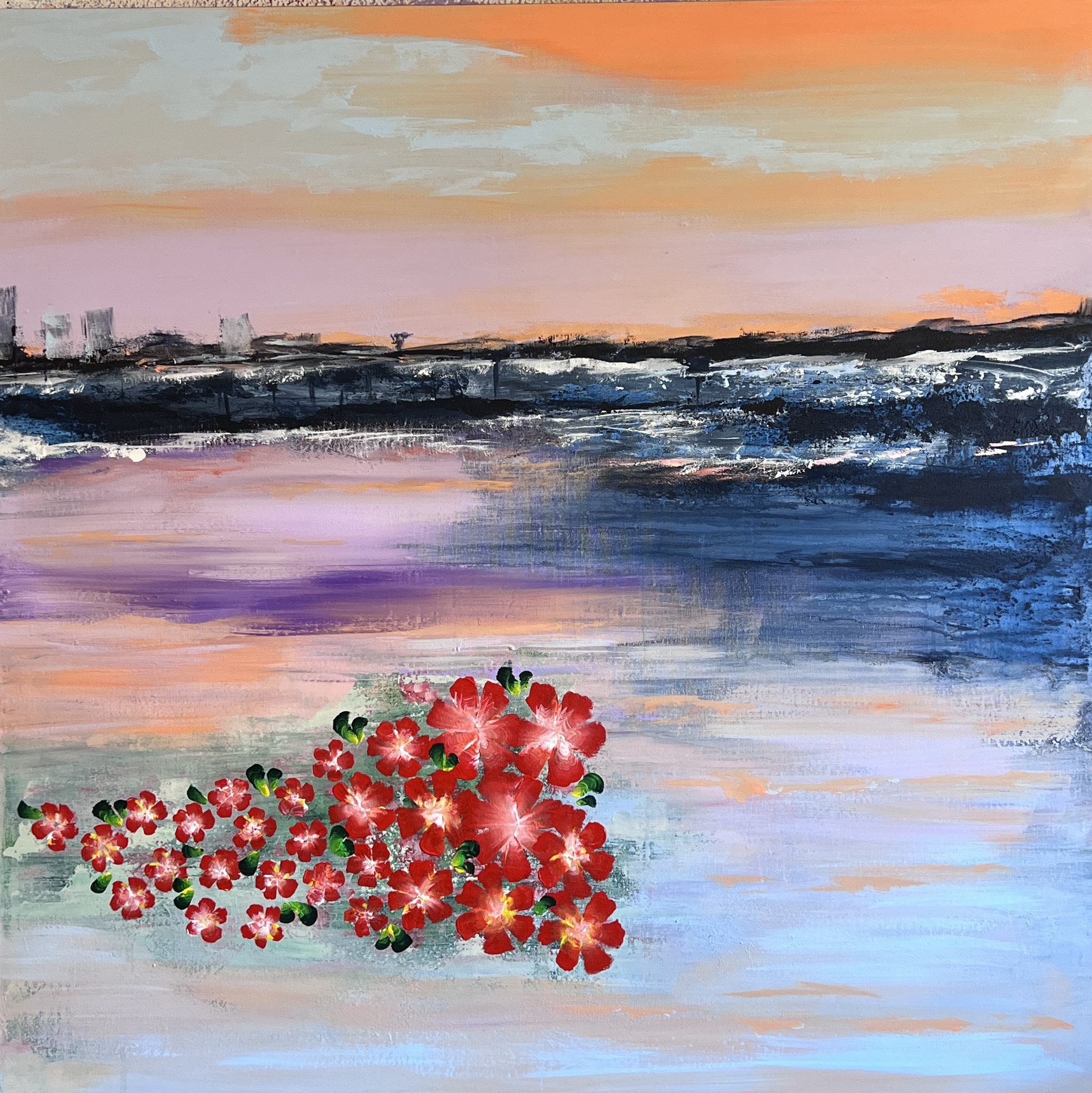 Ik wilde dit schilderij schilderen over beloftes die uit komen in je leven. Het is een kleurrijk schilderij met een prachtige pastelkleurige lucht omringd door water. Wat mijn ogen zien is een land van beloofde rozen. H 100 cm x br 100 cm x d 4 cm gewicht: 3,5 kg Gereed om op te hangen
