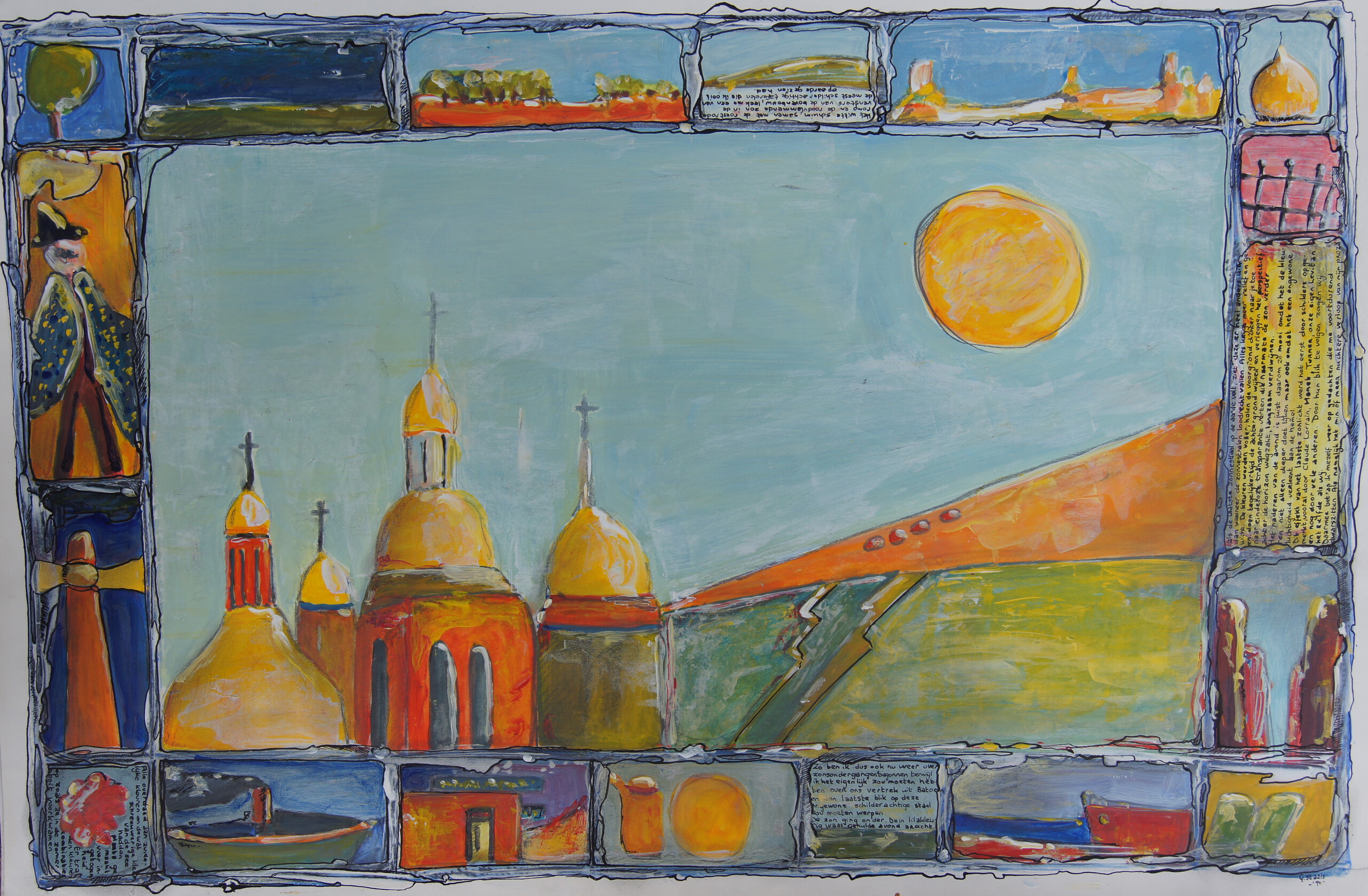 Omdat ik een liefhebber ben van de boeken van de Russische schrijver Konstantin Paustovkij, schilderde ik in 1995 - de Berlijnse Muur was 6 jaar eerder gevallen - een zestal acryl schilderijen (40x60) op 300 grams papier. Paustovskij (in zijn jeugd woonde hij in Kiev) schreef prachtige verhalen over de Oekraïne, Georgië, de Zwarte Zee en steden als Batoemi en Odessa. Batoemi is een stad in het zuidwesten van Georgië aan de Zwarte Zee. Teksten uit 'De reis naar het zuiden' zijn in het schilderij verwerkt, zoals: ● Zo ben ik dus ook weer over zonsondergangen begonnen, terwijl ik het eigenlijk zou moeten hebben over ons vertrek uit Batoem en een laatste blik op deze ongewone schilderachtige stad zou moeten werpen.De zon ging onder. De in lilakleurig waas gehulde avond bracht…