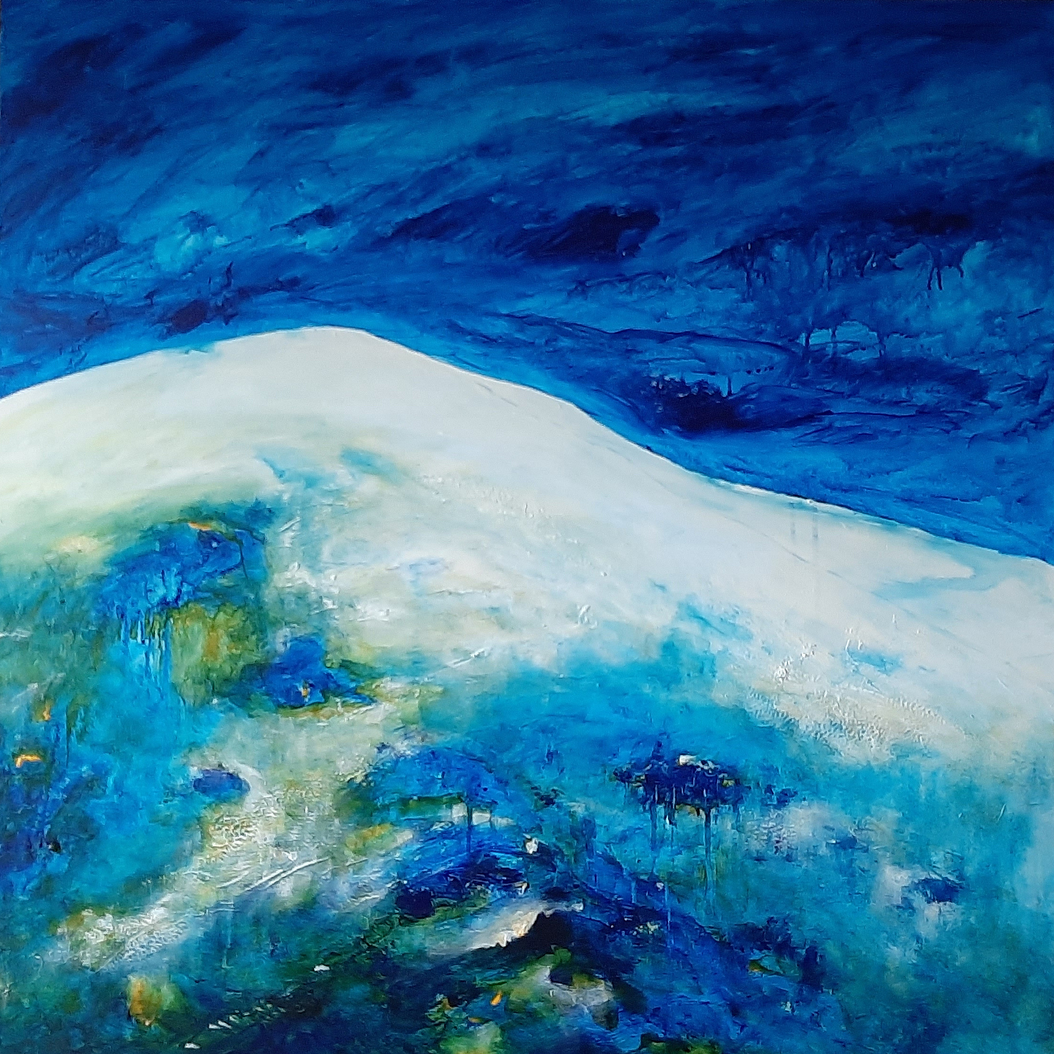 De kleur blauw heeft me altijd geïntrigeerd. Na een aantal schilderijen met grijs-blauwe zeezichten (Normandië), wilde ik nu het iets helderder houden: de Provence, c.q. de Mon Ventoux (1909 meter hoog). De machtige berg in het zuiden van Frankrijk, de Tour de France vrezen deze gigant. Verschillende keren was ik er boven op. Soms werd me de toegang in de vroege lente (mei) nog versperd vanwege de sneeuw. Ik heb in dit schilderij enigszins afwijkend geschilderd van de werkelijkheid: de hellingen lopen in werkelijkheid iets anders, en die sneeuw (het wit) en de onrustige lucht (blauw) beloven niet veel goeds. Het bestaande weerstation op de top ontbreekt. Het is immers MON (mijn) VENTOUX. Alleen met zichzelf: de natuur.