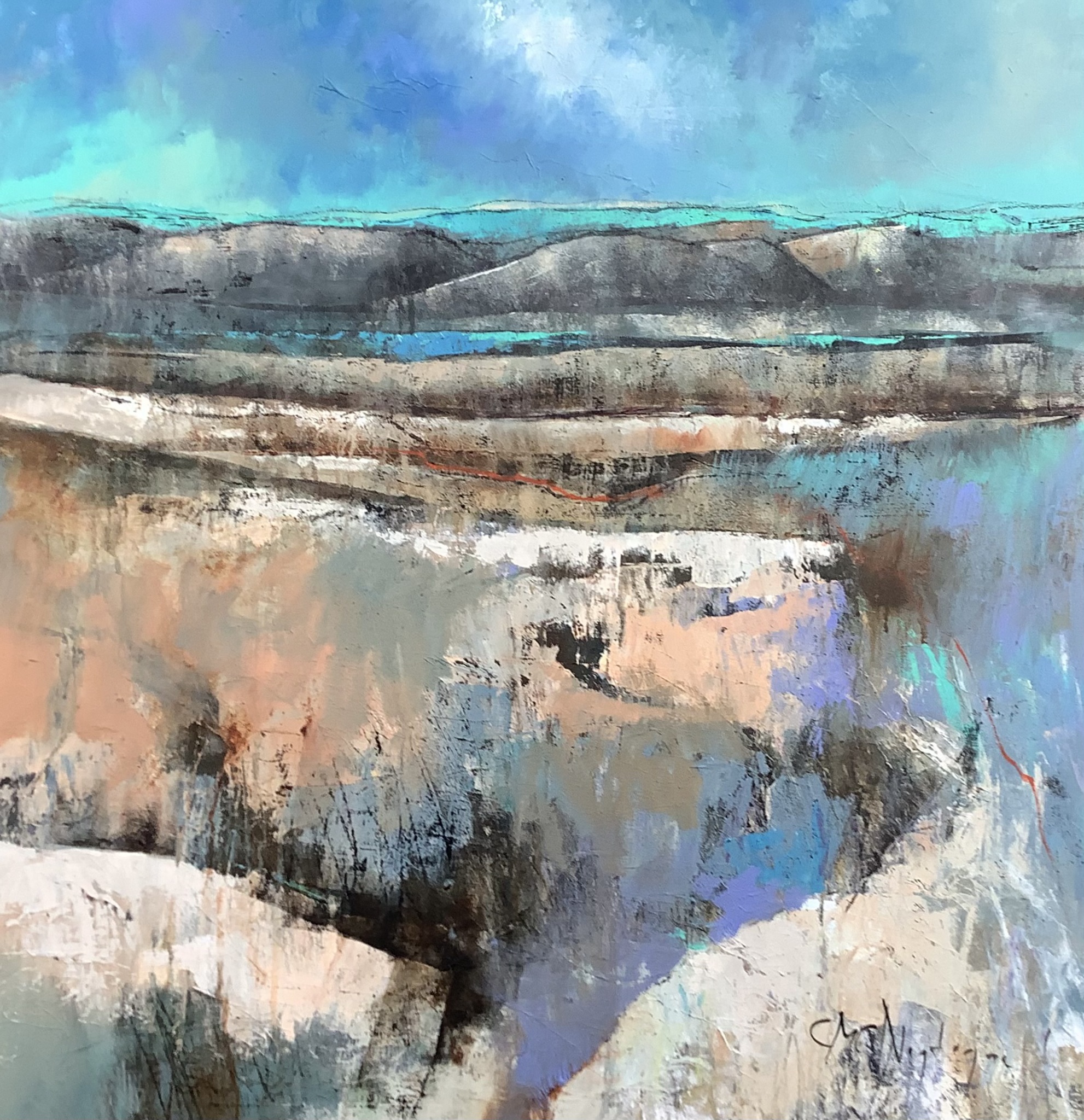 Een schilderij over een woest en eenzaam landschap . De kleuren zijn zoals in de ochtend warm waar de zon komt en koud in de schaduw. Dit schilderij wordt aangeboden met baklijst. acryl en monotype op doek