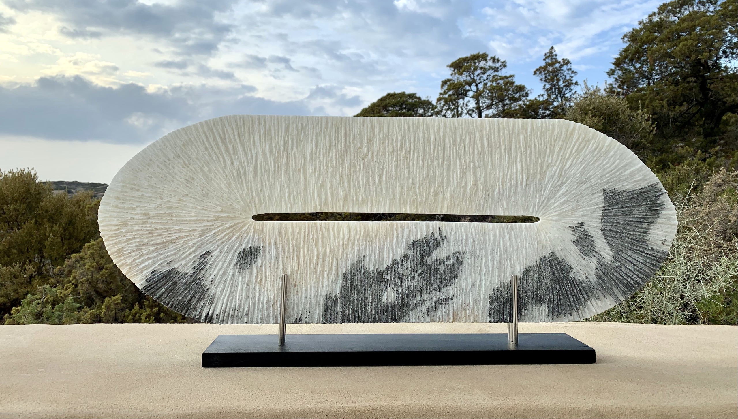 Een vrouwelijke wereld uit steen geboren. Mijn beelden dragen “het eeuwig vrouwelijke” in zich. Zij vertegenwoordigen mijn communicatie met de steen, de lijnen en structuren die zijn ontstaan door de tijden en de steen haar eigen taal geeft. Met name het samengaan van mijn innerlijke taal en die van de steen is één van de boeiende aspecten van het werken met steen: het bevrijden van een nieuwe wereld uit het eens zo vormeloze.