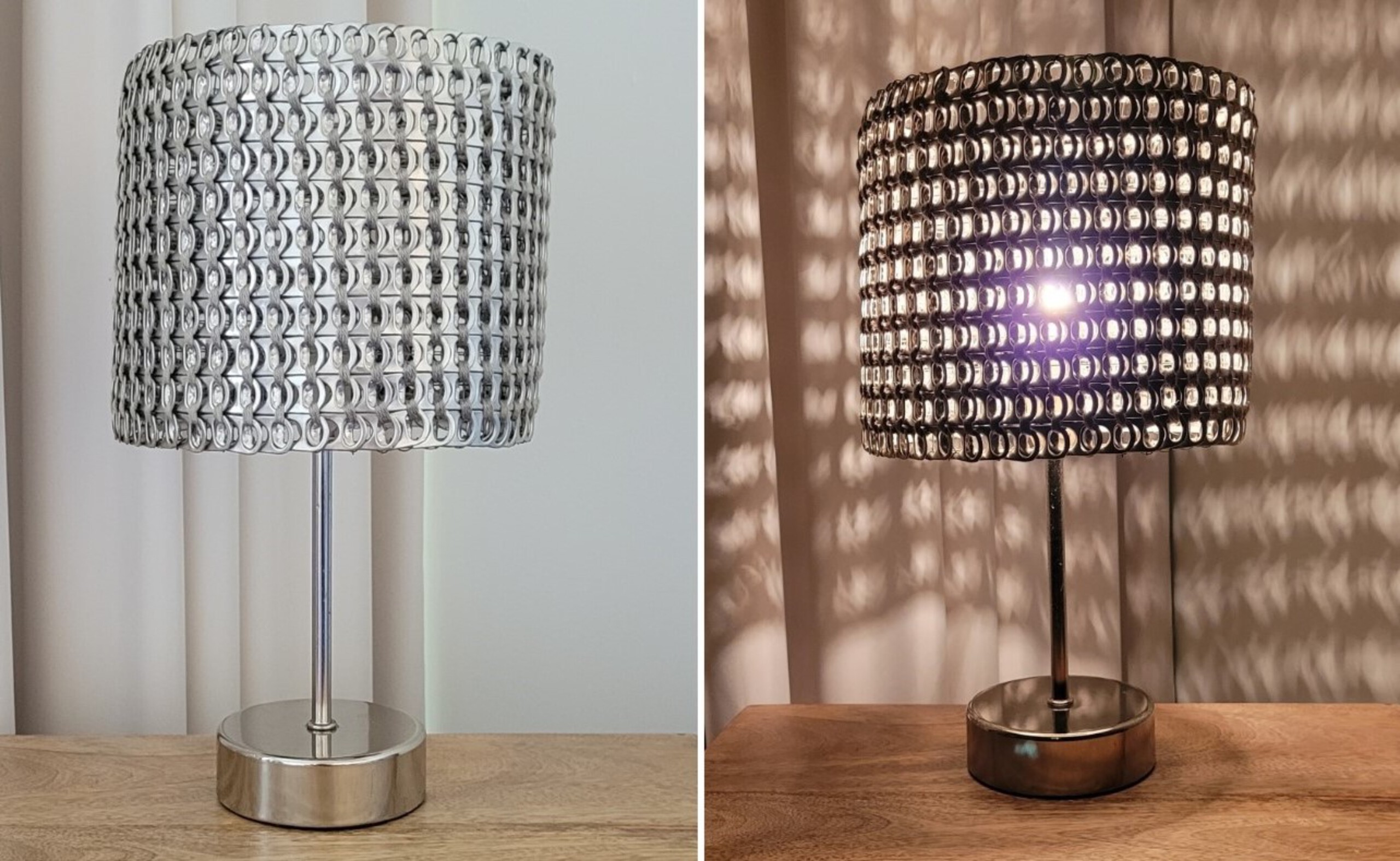 Bijzondere lamp met lampenkap van lipjes van blikjes