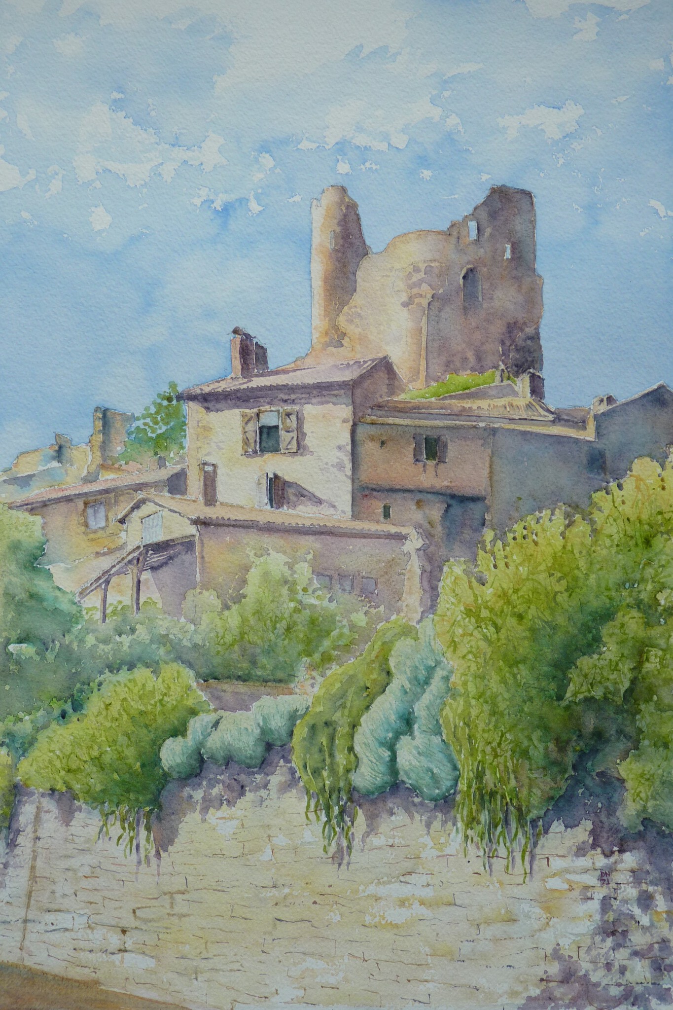 Kasteel Penne vanaf de straat beneden op een zonnige dag. Deze aquarel is geaccepteerd voor de International Watercolour Society expositie in Albi, Frankrijk. Art Connexion Mondiale in Espace Art, 13 plas Fernand,Pelloutier, 81000 Albi. 25 - 30 maart 2022. De aquarel heeft een "Top 50 Award" gekregen van de Franse organisatie. Hij werd in de IWS Holland expositie getoond in Het Stroomhuis, Neerijnen tussen 27 juli en 28 augustus 2022.