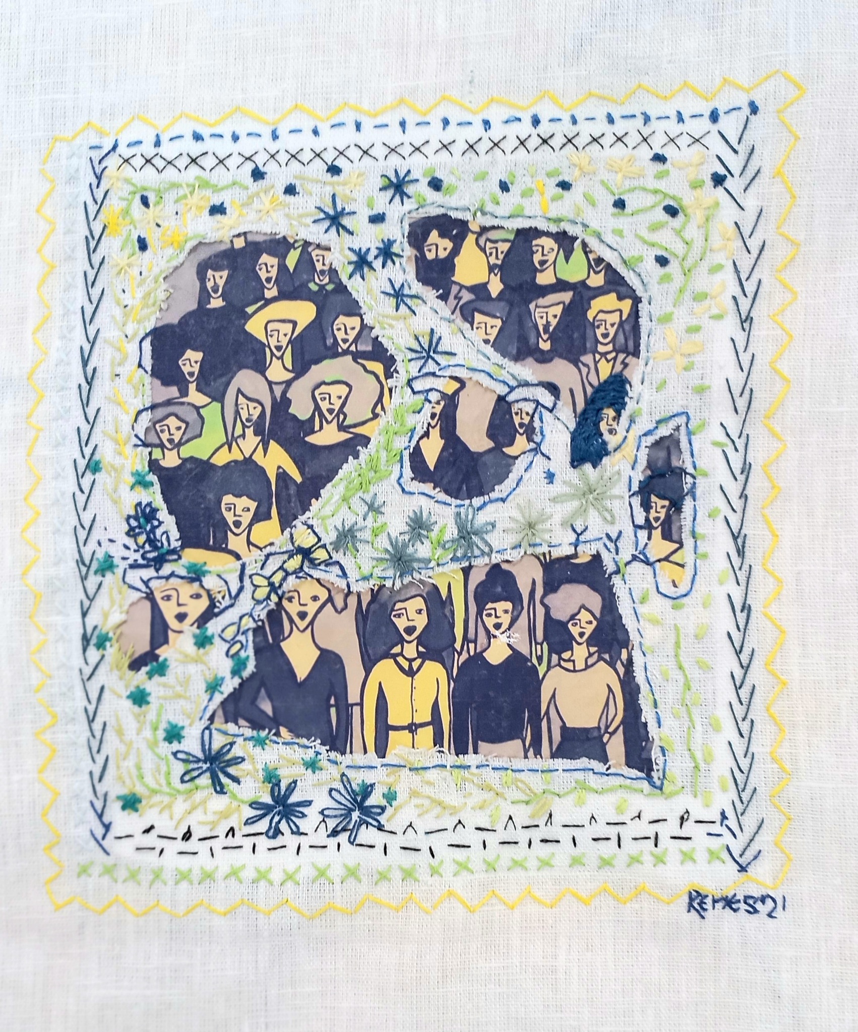 gemanipuleerde foto van een oude gouache op transfer, met borduurwerk op linnen