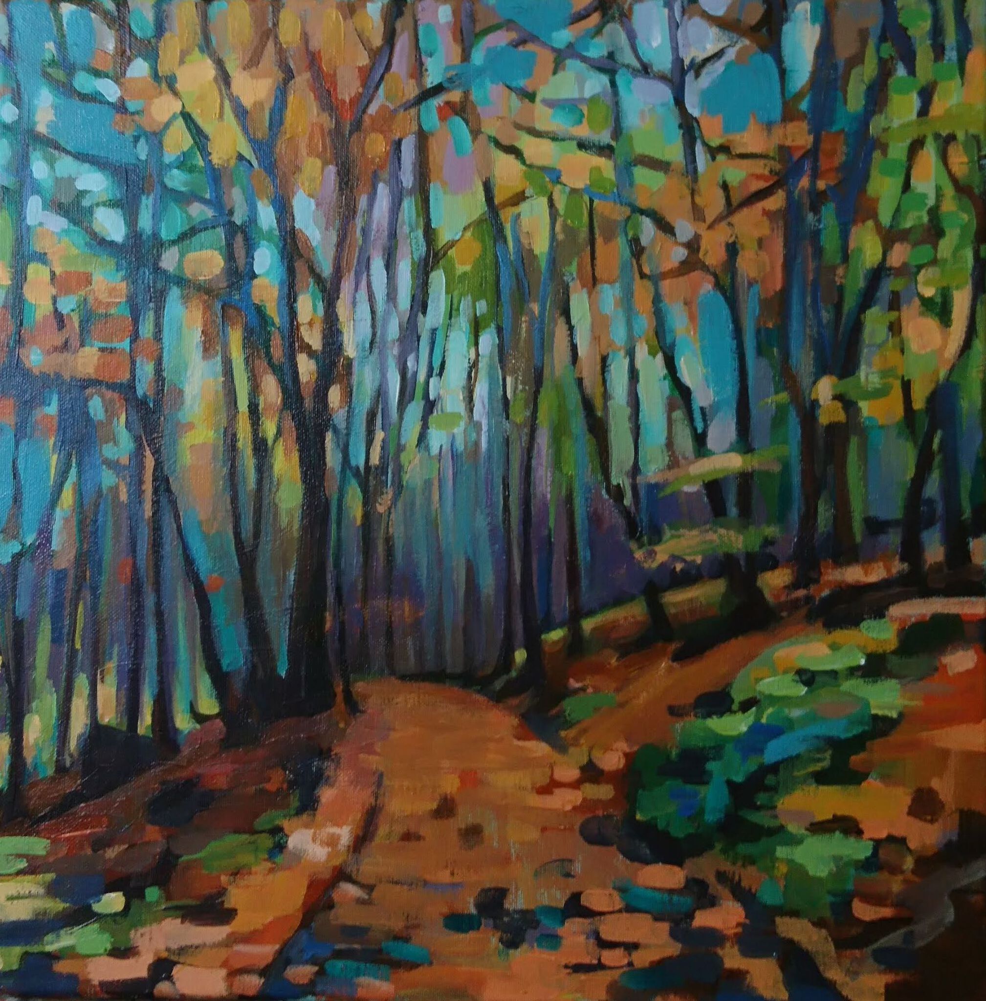 Impressionistisch schilderij van een herfstbos met bospad.