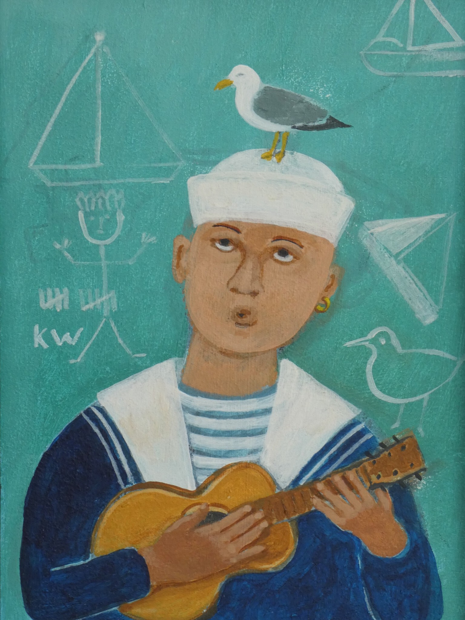 Matroos met gitaar zingt lied voor de meeuw op zijn hoofd