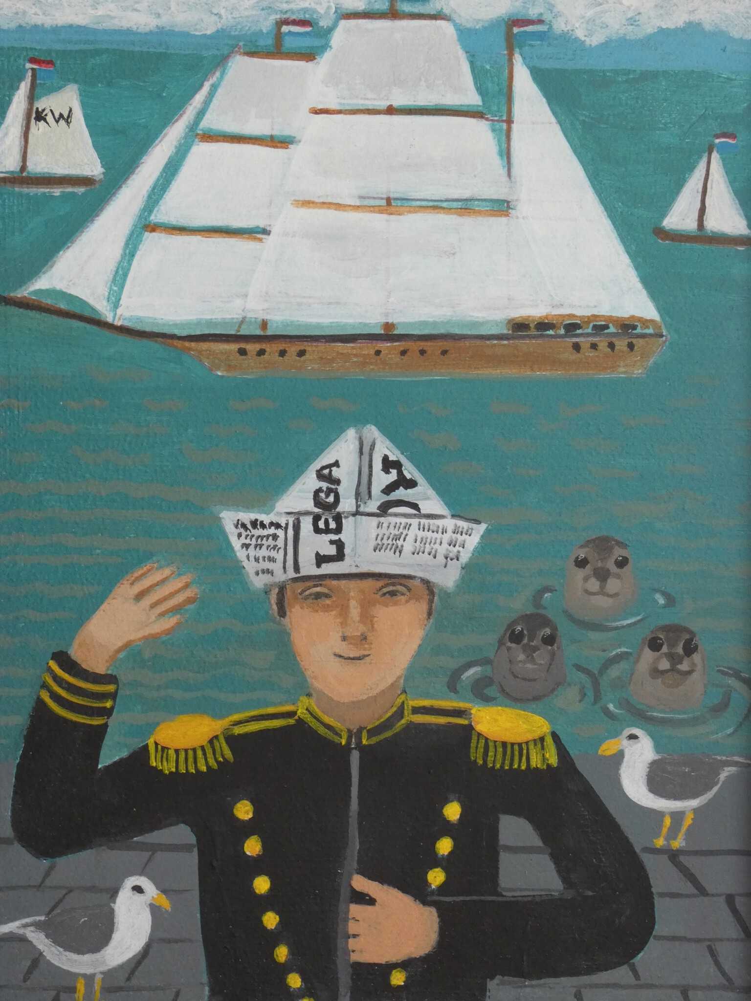 Admiraal groet schip drie zeehonden en twee meeuwen kijken toe