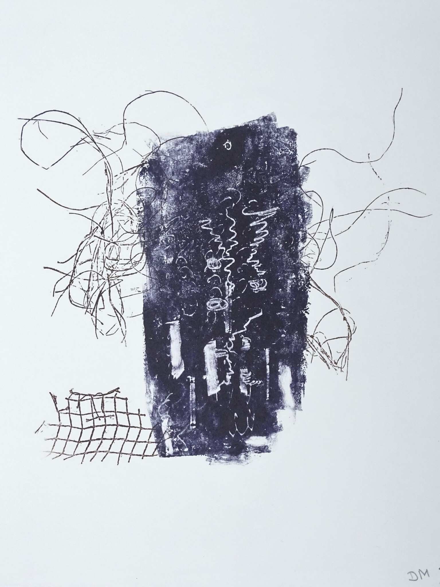 "Waar en wanneer zoekend het hart van de zinnen / de nucleus van schichten / de kern van een houding of de gouden schenkkan / en nog meer het skelet zelf // dan moet worden erkend / dat de krassen op het oppervlak / weinig zeggen over de inhoud" (monoprint)