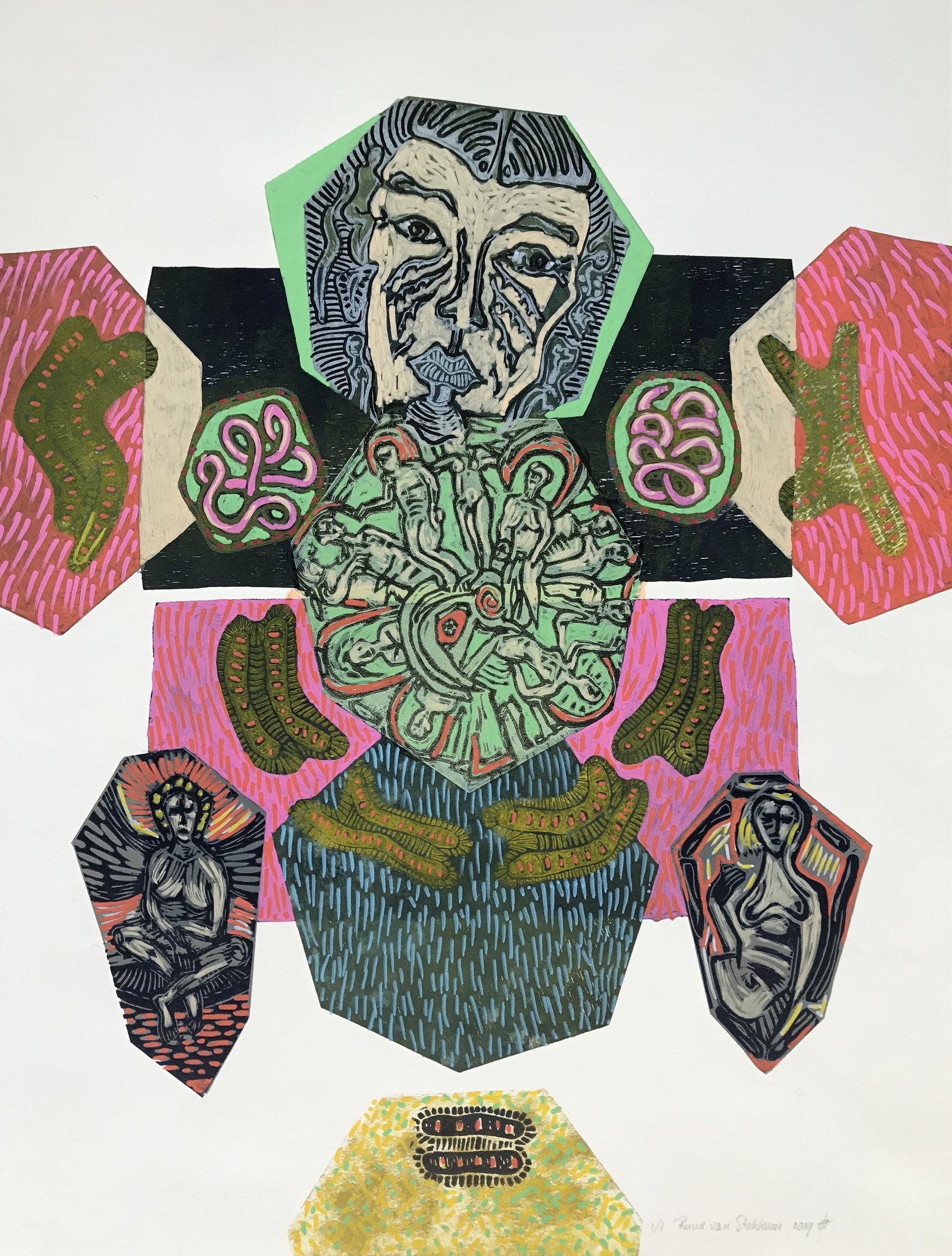 Z.T. A2 eenmalige compositie met linosneden , geen oplage (monoprint) gedeeltelijk handmatig ingekleurd