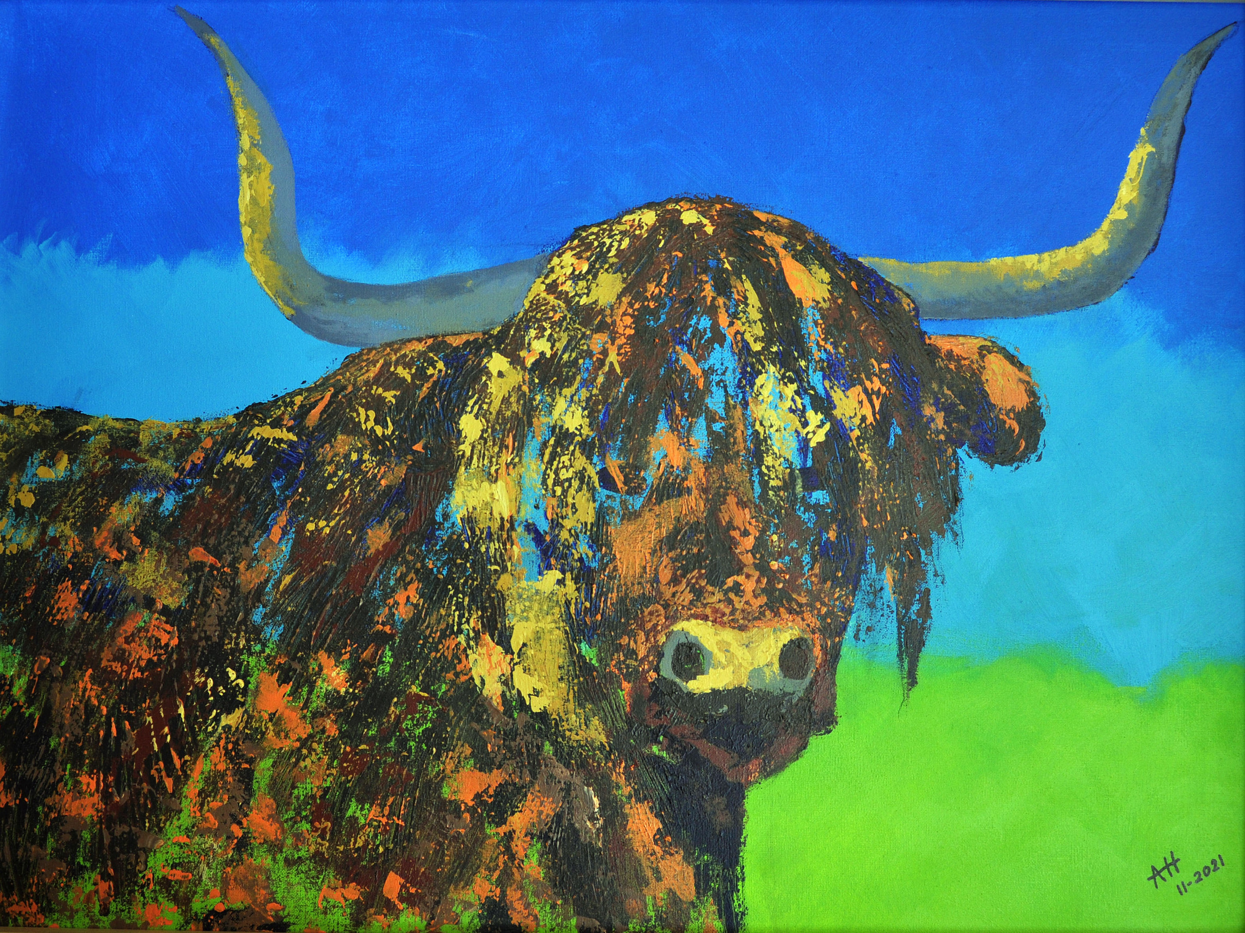 Kleurrijke Schotse Hooglander. Gemaakt met paletmes mijn favoriete gereedschap
