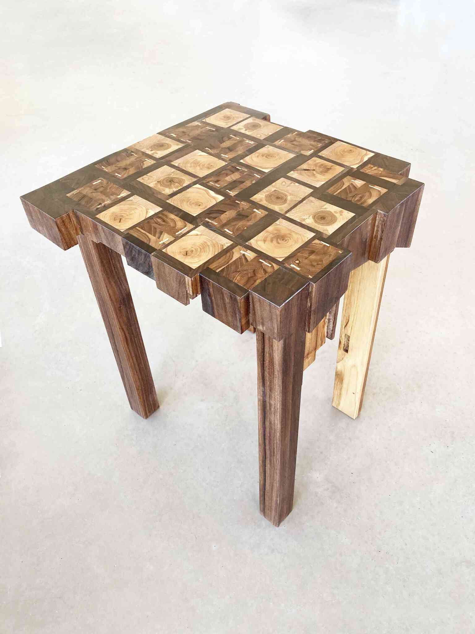 Een vierkante tafel, of toch niet….? Iets is unsquare als het niet klopt, maar ook weer wel. Een onvierkante tafel dus. Gemaakt van onder andere honingkleurige jeneverbes en donker walnotenhout. Houtsoorten: beuken | jeneverbes | walnoot | teak Afmetingen: ca. L38x B37 x H50 Afgewerkt met Osmo coating