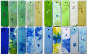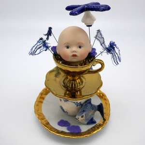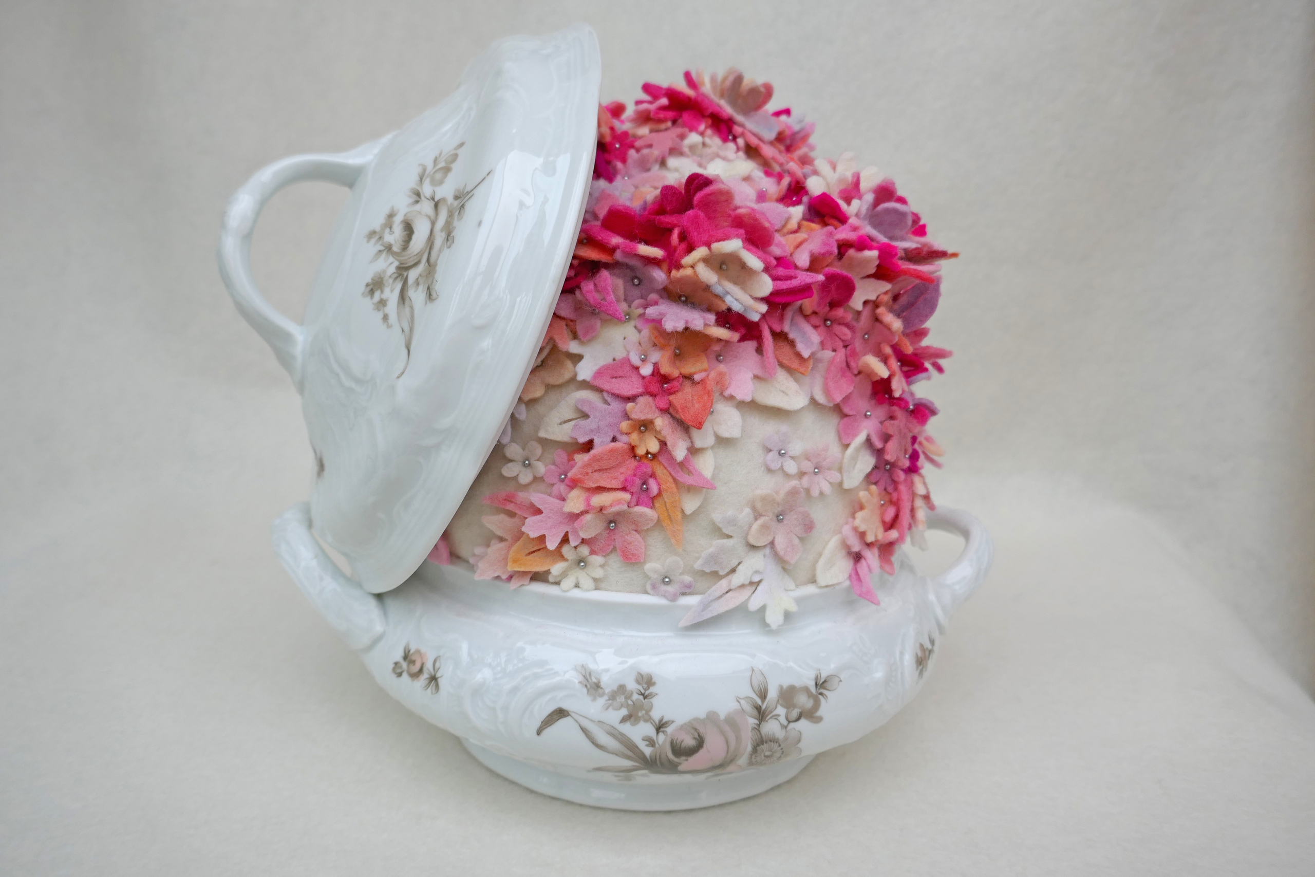 Handgeverfd wol vilt, keramiek, spelden, foam.