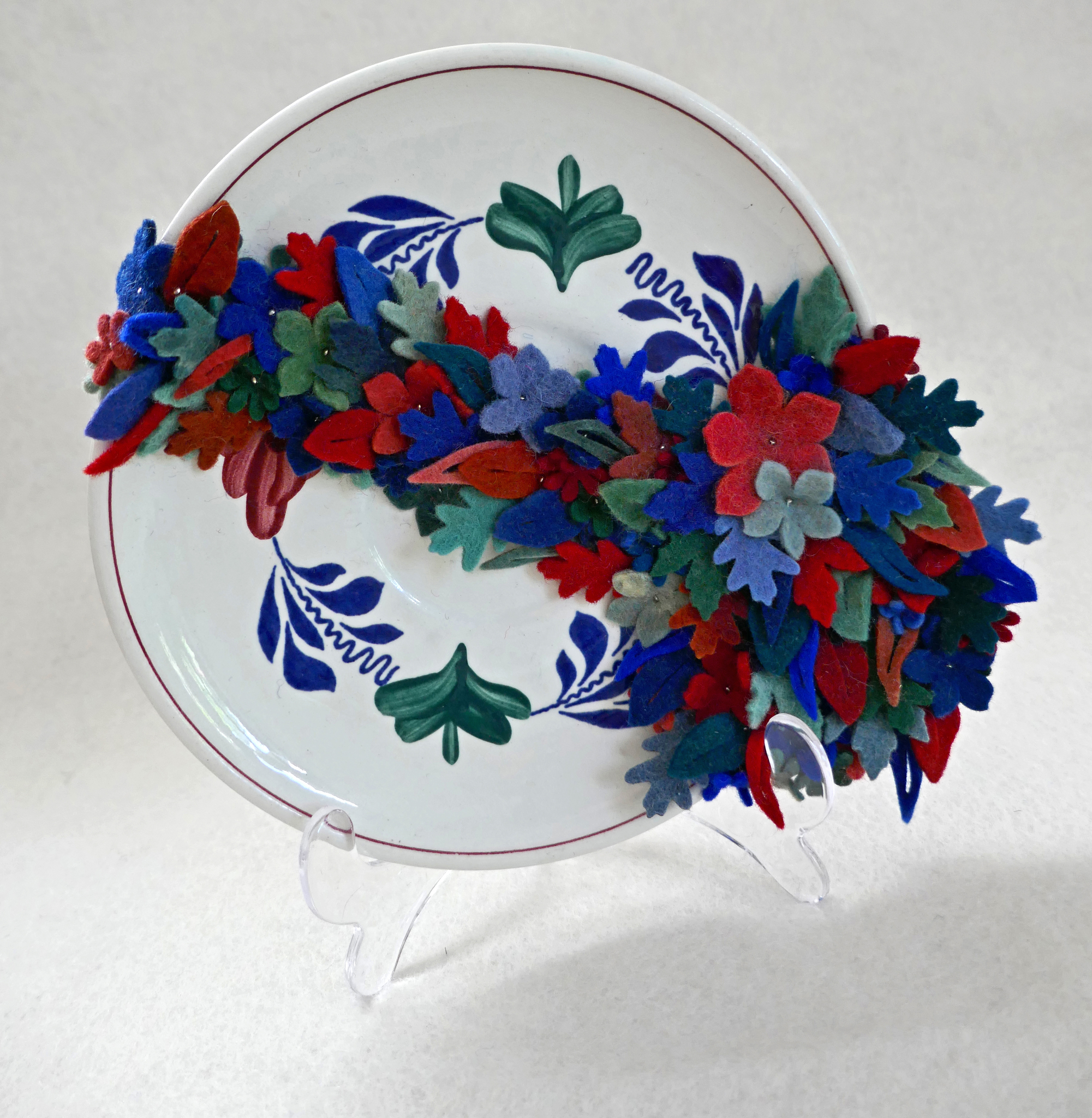 Deels handgeverfd wol vilt, kapot keramiek, borduurgaren, spelden.
