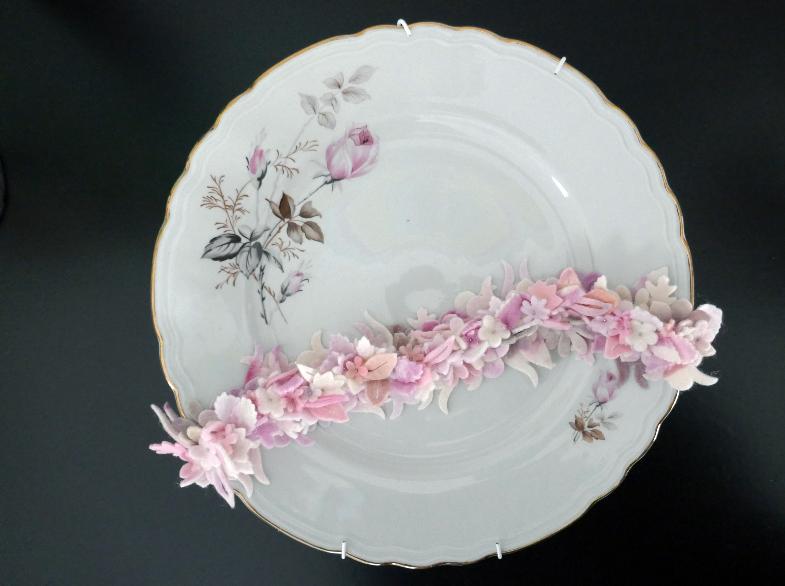 Deels handgeverfd wolvilt, kapot keramiek, borduurgaren, spelden.