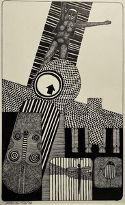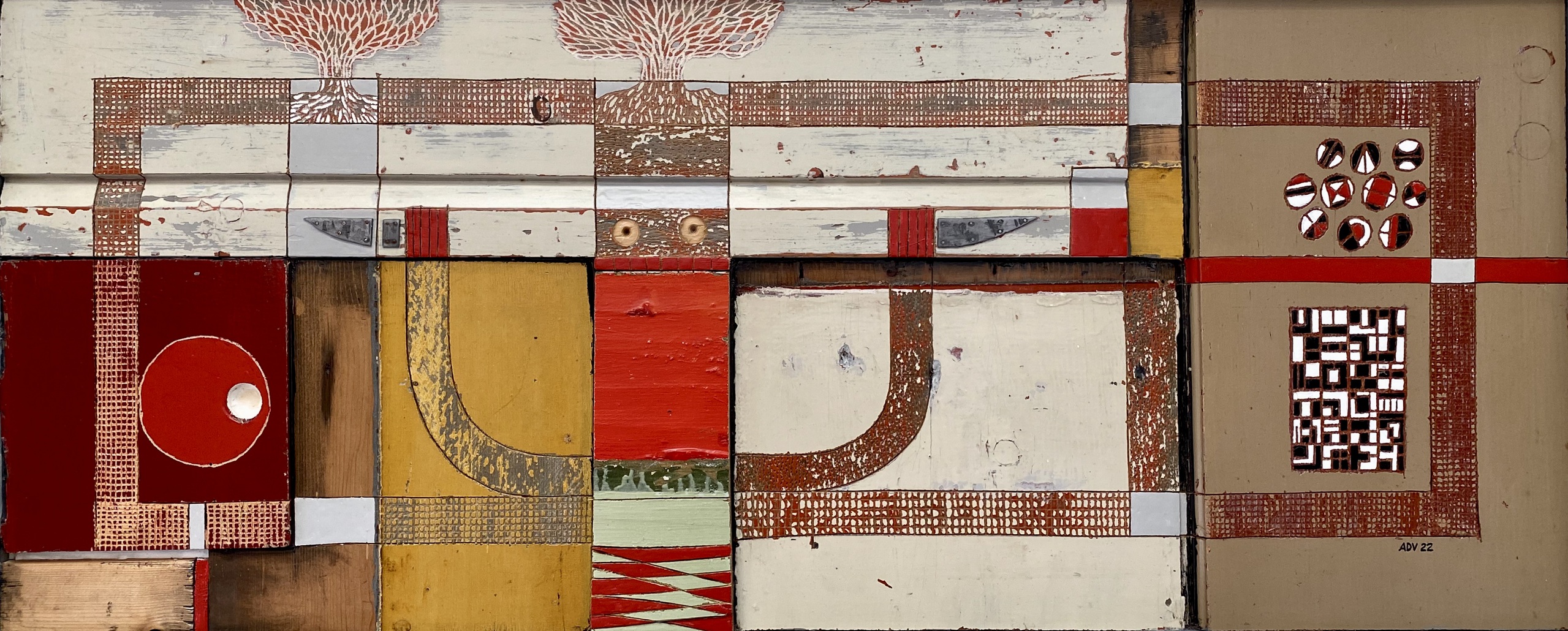 Assemblage van meerdere stukjes plank en ander hout. Vaak met originele basiskleuren. Soms blank hout. Bewerkt met multitool zaagje, priem, stanleymes, schuurpapier en boor. Hier en zijn diepere verflagen tevoorschijn gekomen. Toegevoegd zwart, wit, rood en grijs. Ook acrylaatkit en lood.