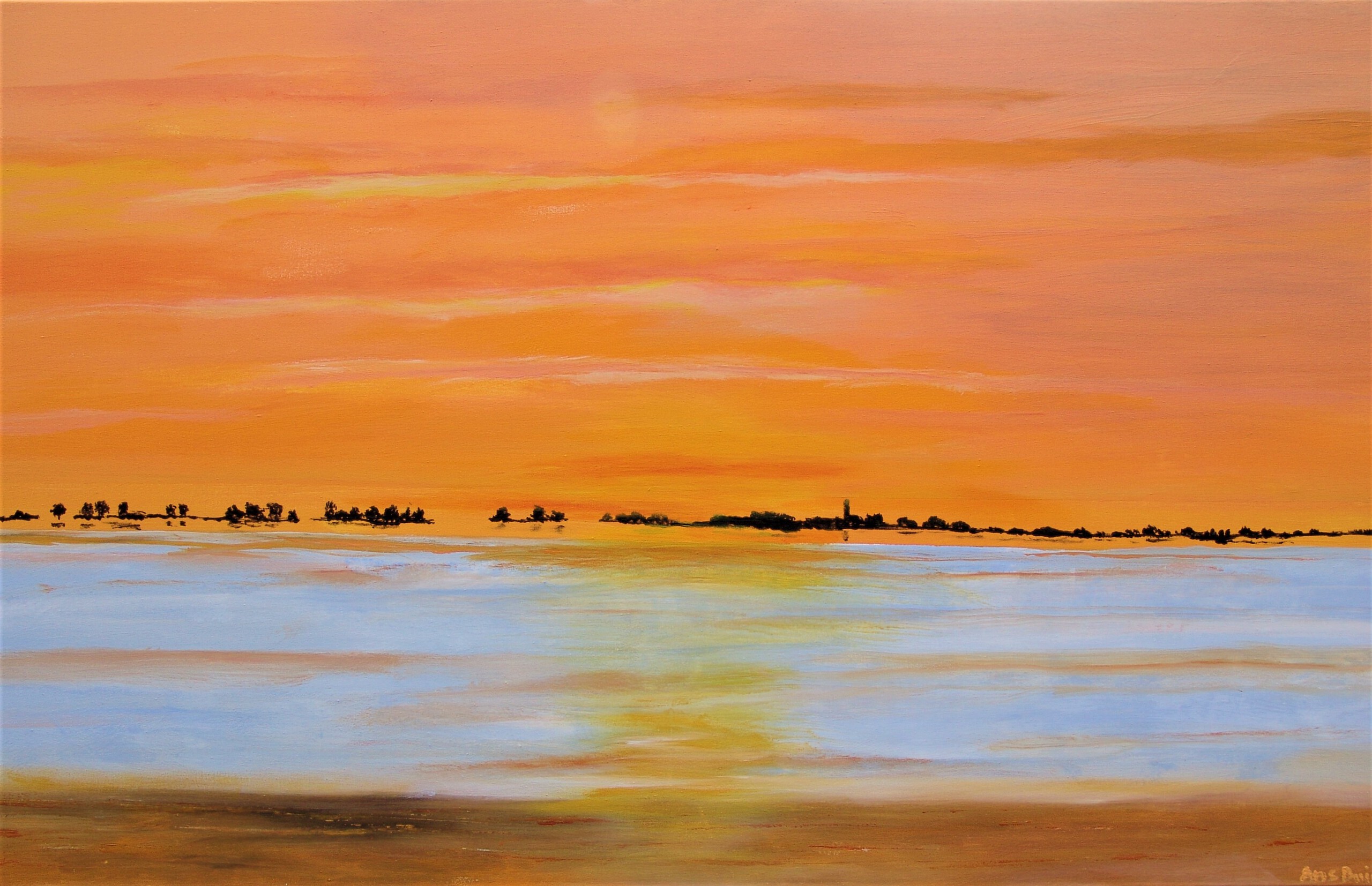 Ans likes to paint landscapes in expressive colors and filled with flowers in her own style. However, sometimes a while of reflection, some rest after a very busy period including hospitalizations.Hence a beautiful quiet landscape, but of course again in a nice warm expressive color sky, villages at the horizon reflected in the last light of the day. Of course, including hanging work and if you want to see more photos or painting in real life, call or email for a non-binding appointment. The coffee or tea is ready.V AA.